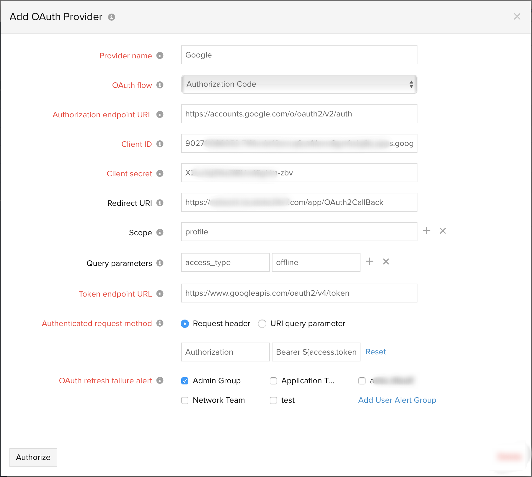 根据应用程序请求授权的方法以及 API 支持的授权流程,OAuth Provider 表单的呈现方式会有所不同。在 OAuth Provider 表单中提供相关详细信息: