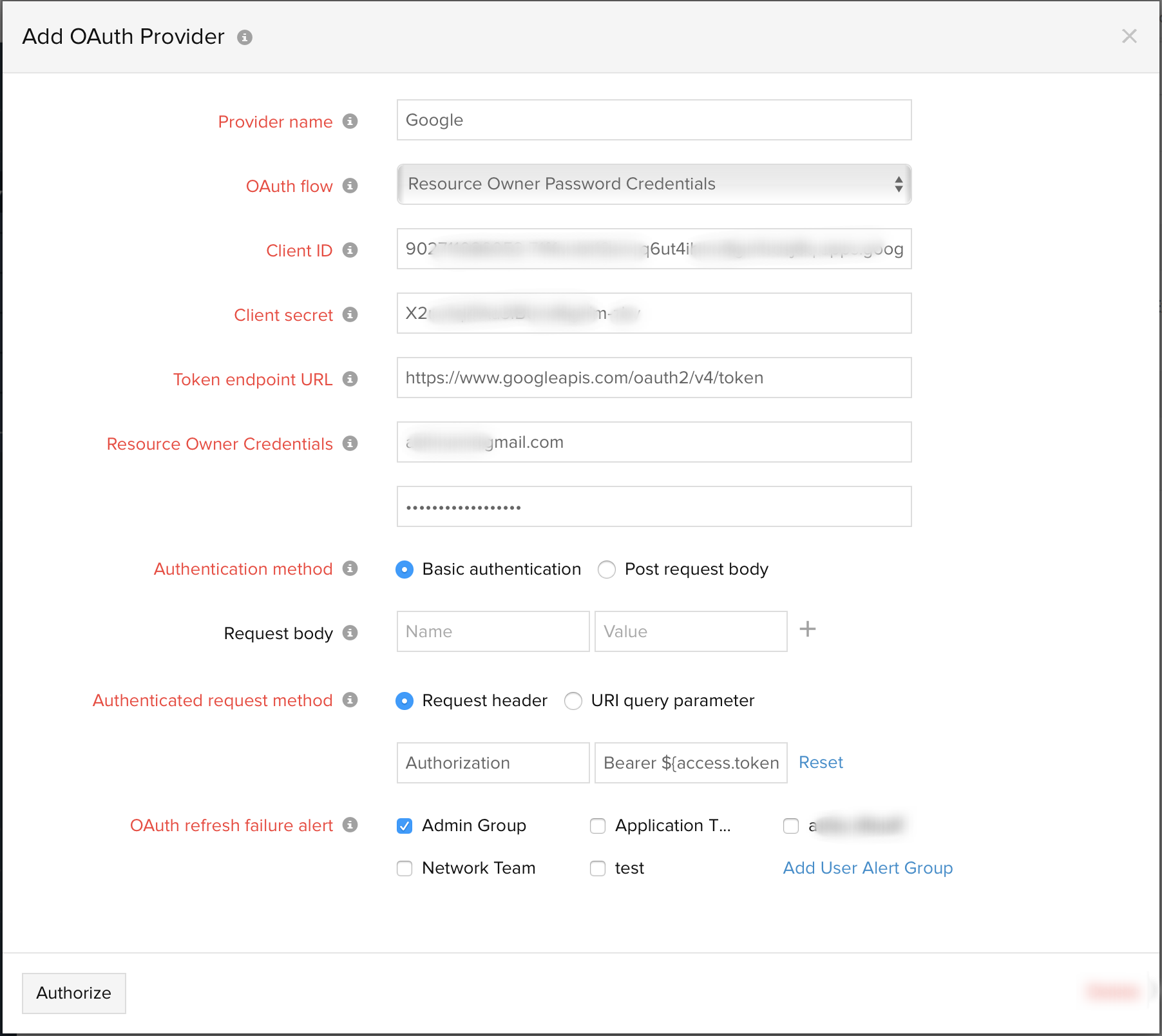 - OAuth flow:将此字段指定为 资源所有者密码凭证。