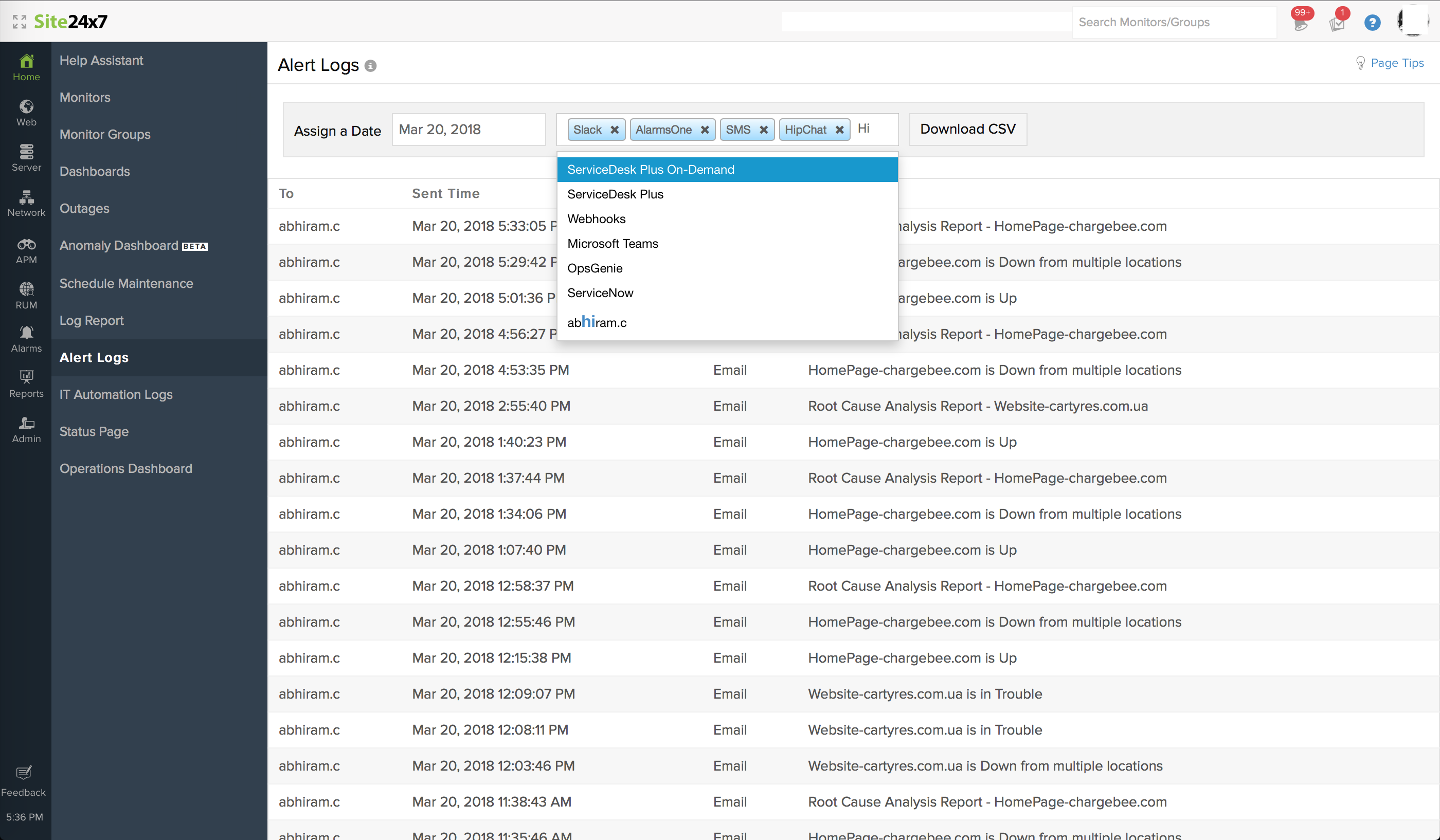 您可以访问从您的 Site24x7 帐户发送的所有告警的详细日志。您可以通过过滤告警模式并指定日期范围来生成报告。告警日志将提供告警发送给谁、触发告警的时间、告警模式和中断原因等数据。您可以将告警日志导出为 CSV 文件并与您的客户共享。