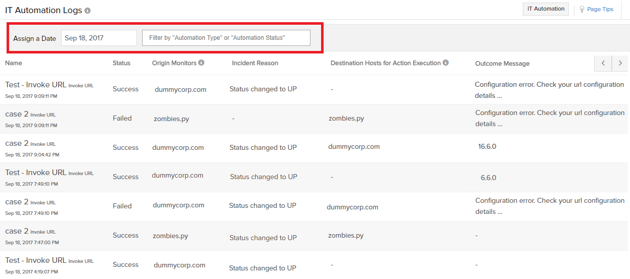 在此页面中查看按日期执行的所有自动化的详细历史记录和状态。按自动化类型或自动化状态分配日期和过滤器。