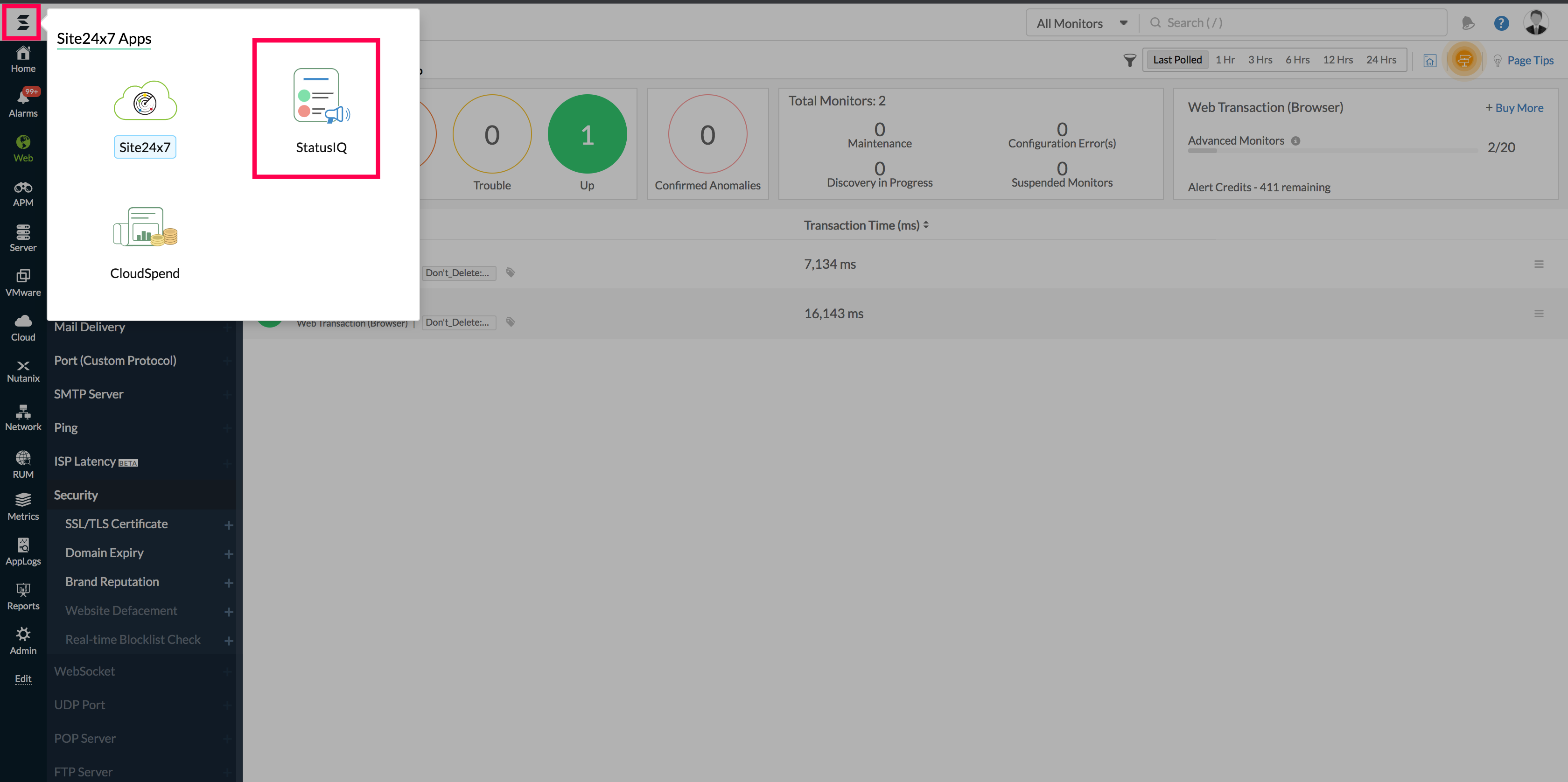 所有状态页面现在都迁移到 StatusIQ。使用 Access StatusIQ 按钮创建新状态页面或管理现有页面。您还可以使用 Web 客户端左上角的产品图标访问 StatusIQ,如下所示: