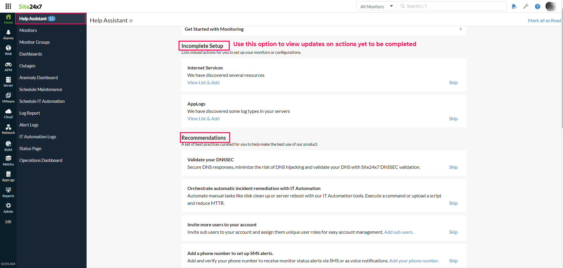 - 接收针对您的 Site24x7 设置的主动、可操作和个性化的建议。