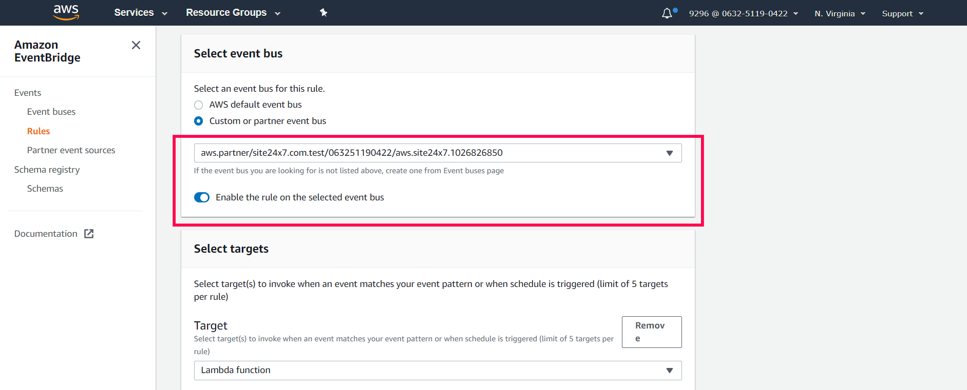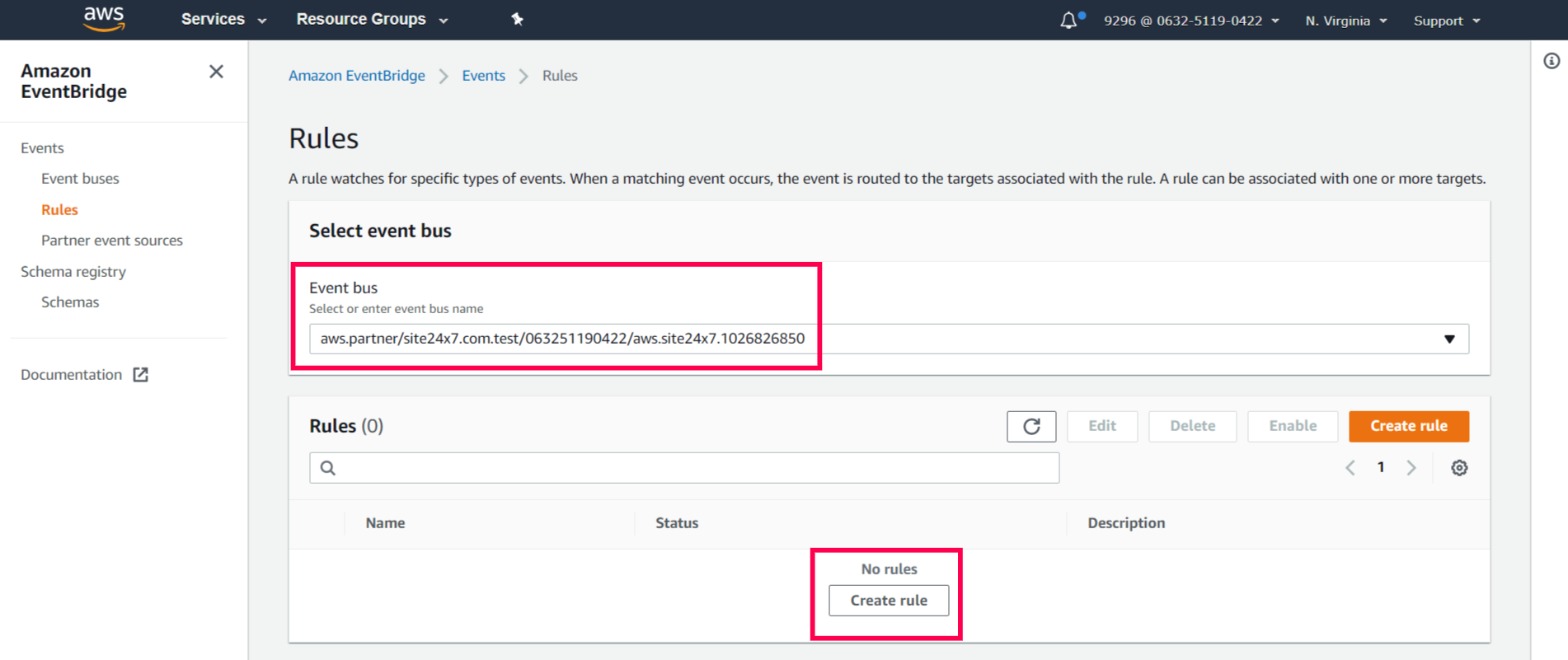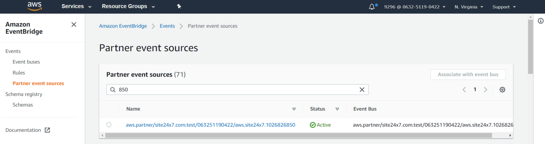 - 单击保存后,在 Site24x7 控制台中创建的事件总线将自动添加到 AWS 控制台的合作伙伴事件源部分。