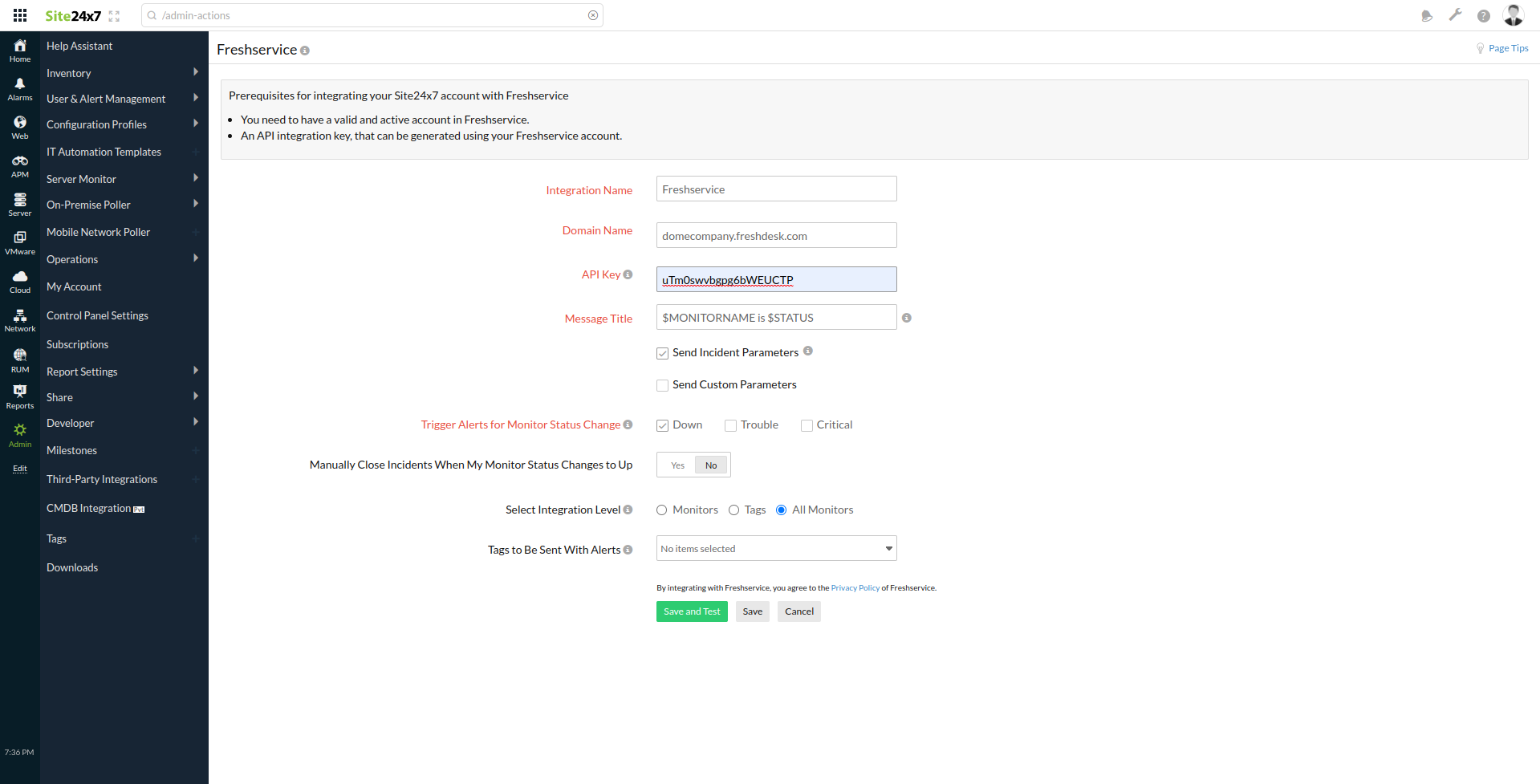 - 选择集成级别:您可以从特定监视器、与选定标签关联的监视器或您帐户中的所有监视器发布状态告警和 RCA 链接到 Freshservice。默认情况下,此字段设置为所有监视器,以实现真正的全局集成,您的 Site24x7 帐户中的所有告警都会推送到 Freshservice。