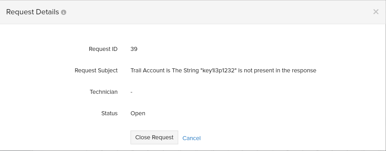 - 请求完成后,将弹出一个“请求详细信息”窗口,为您提供工单的详细信息,包括工单 ID、主题行、技术员姓名和工单状态。