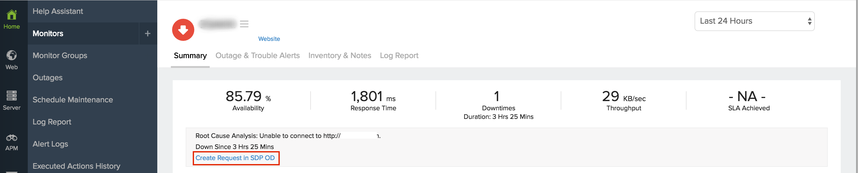 在手动模式下,操作员必须访问监视器汇总仪表板或RCA页面中的整体状态小窗件下提供的(创建请求)链接,然后提交“创建请求”以在您的 SDP On-Demand 中手动生成工单门户网站。工单上还记录了有关监视器停机时间的详细说明。通过提交“关闭请求”,您可以从 Site24x7 控制面板中远程关闭工单。 - 选择集成级别:您可以从特定监视器、与选定标签关联的所有监视器/监视器组或您帐户中的所有监视器向 SDP On-Demand 发布告警 。 默认情况下,它设置为“所有监视器”。因此,它转化为全球集成,您的 Site24x7 帐户中的所有告警都被推送到 SDP On-Demand。