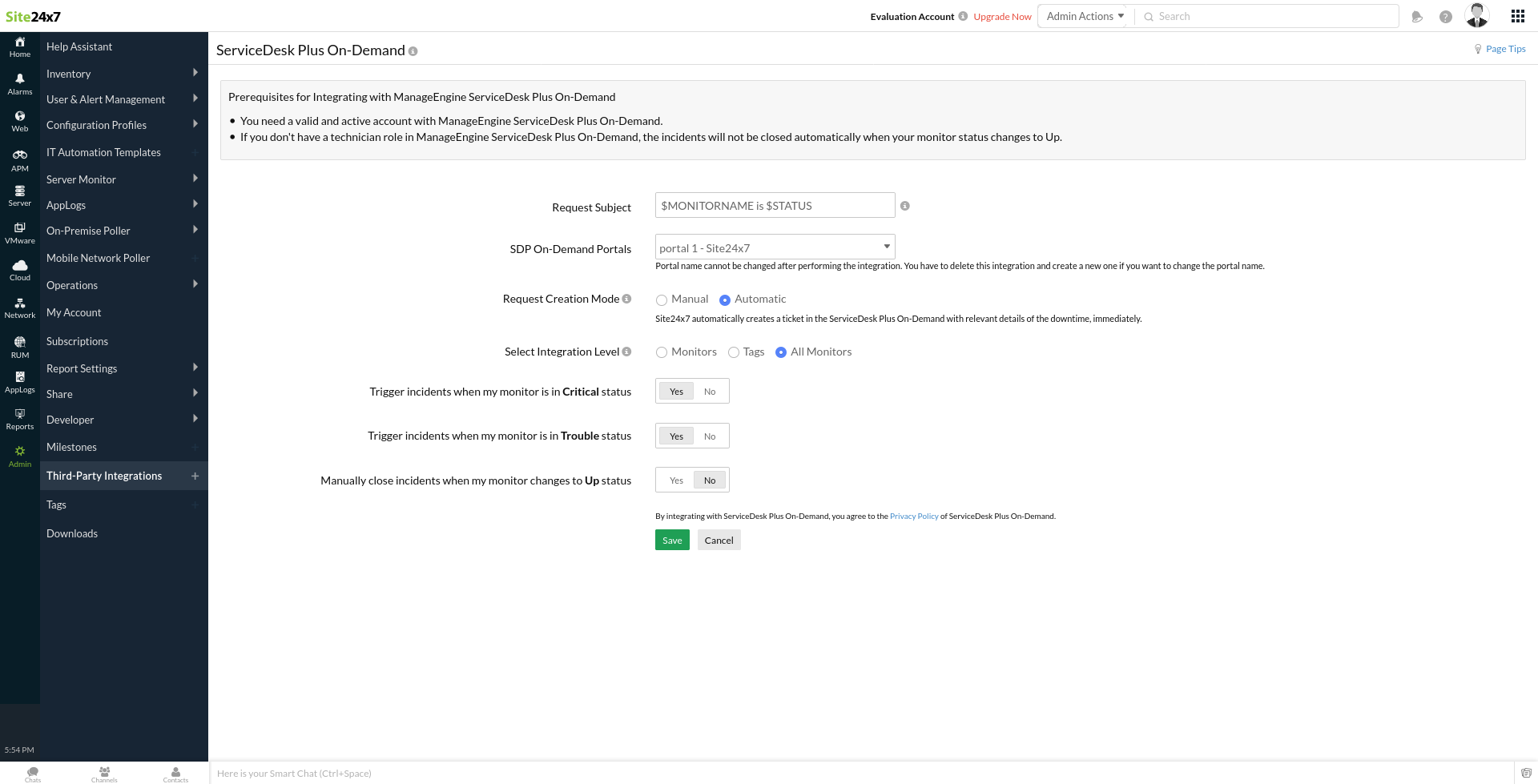 - 如果您是您的 Site24x7 帐户的Zoho 组织管理员,但没有预配置 SDP On-Demand 帐户,则会自动创建一个试用帐户,然后您必须导航到 SDP On-Demand 帐户来配置设置。
