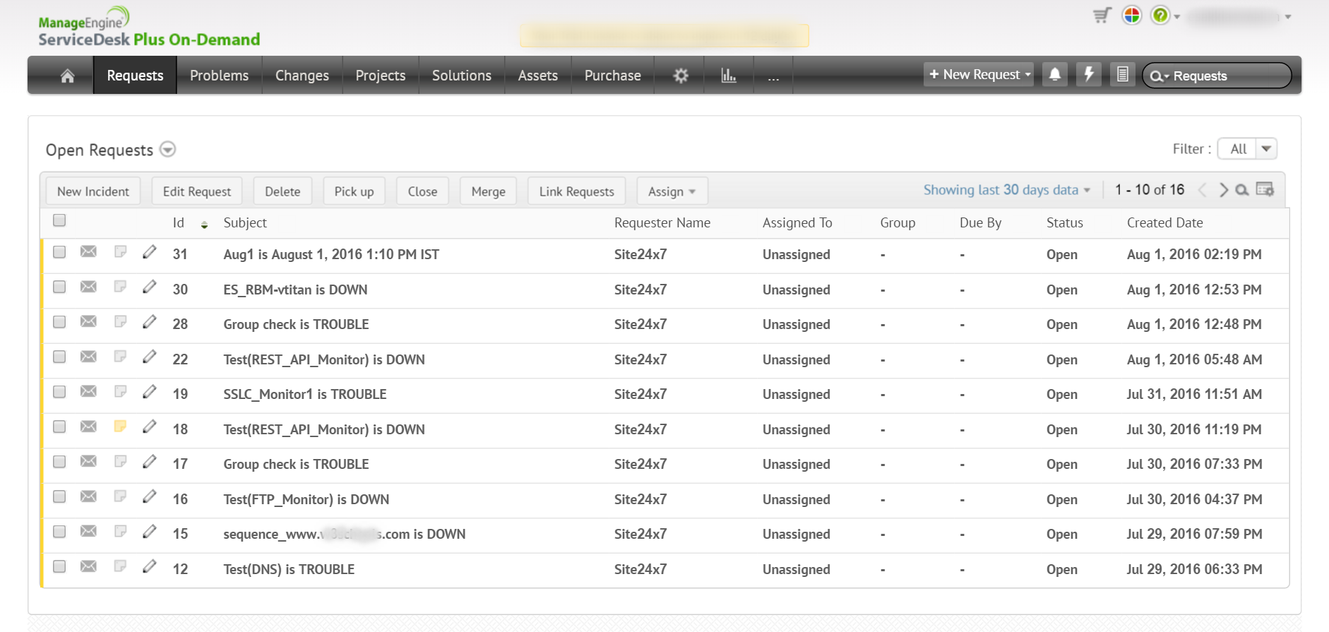 在自动模式下,来自 Site24x7 的停机/故障告警会自动在您的 SDP On-Demand 门户中记录工单。工单上还记录了有关监视器停机时间的详细说明。在 Site24x7 中解决事件后,工单将自动关闭。或者,通过发起“关闭请求”,您可以从 Site24x7 控制面板中远程关闭工单。