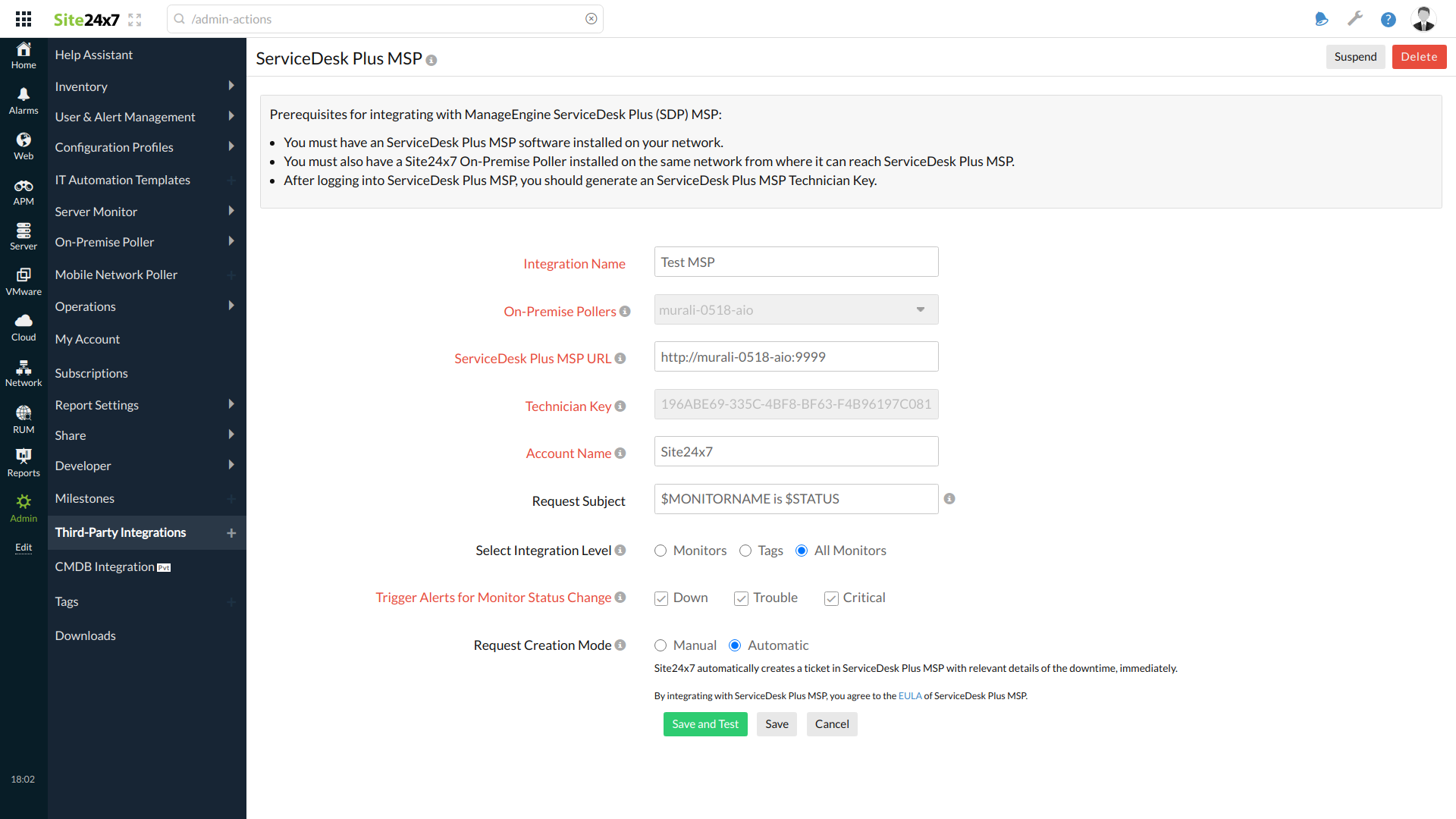 - 帐户名称:指定在 SDP MSP 中创建的帐户名称。来自 Site24x7 的告警将在配置的 SDP MSP 帐户下创建为工单。