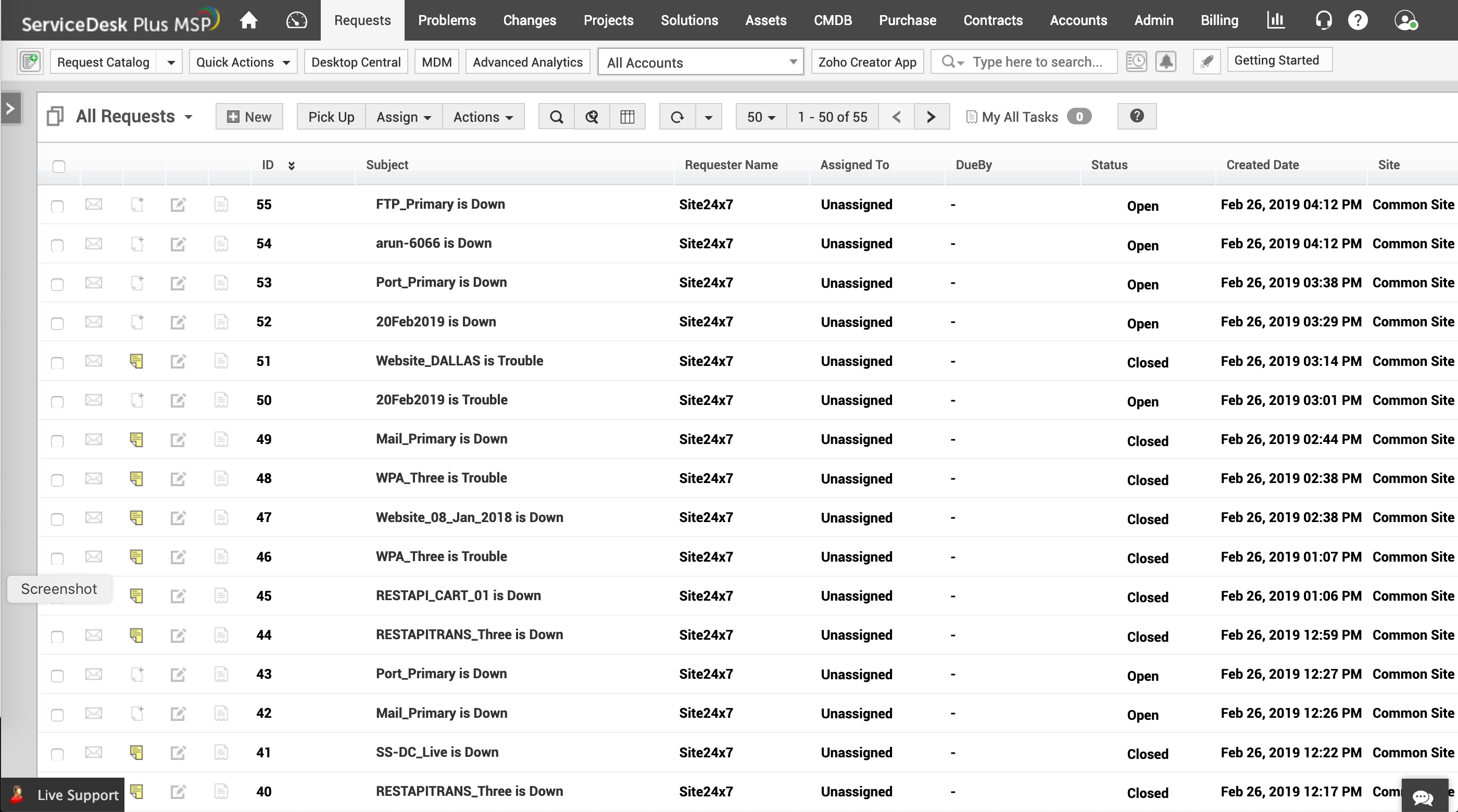 将您的 Site24x7 帐户与 SDP MSP 集成后,您将能够在 SDP MSP 客户端内的单个仪表板中查看所有告警工单。最重要的是,任何状态更改都记录在 SDP MSP 客户端中,并带有适当的描述。在 SDP MSP 门户中,您可以将工单分配给技术人员并执行更多操作。但是,当SDP MSP 应用程序本身不可访问时,不会在您的 SDP MSP 门户中记录任何停机/故障/严重工单。
