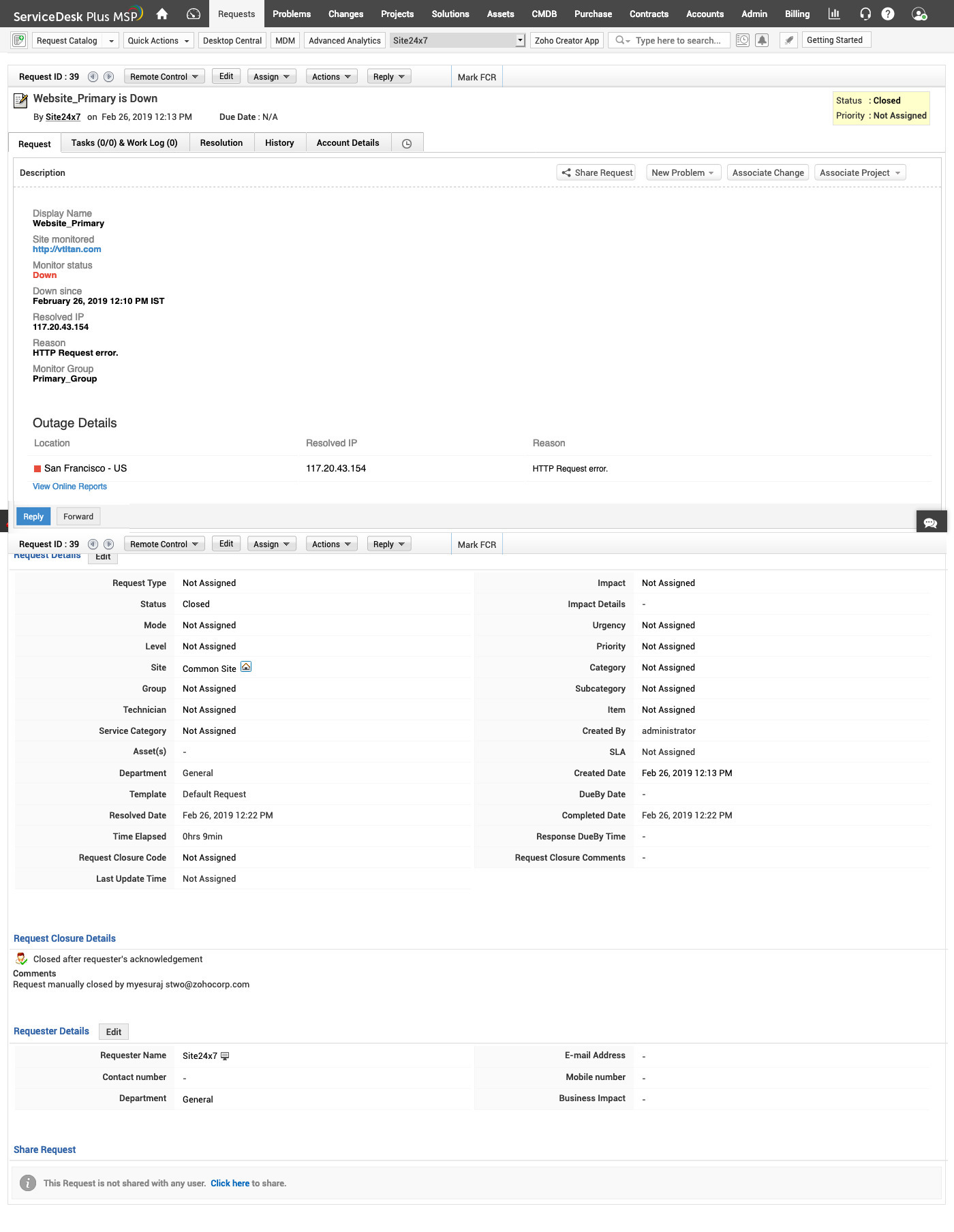 在手动模式下,操作员必须访问监视器汇总仪表板或RCA页面中的整体状态小窗件下提供的(在 ServiceDesk Plus MSP 中创建请求)链接,然后提交“创建请求”以在您的SDP MSP 门户。工单上还记录了有关监视器停机时间的详细说明。通过提交“关闭请求”,您可以从 Site24x7 控制面板中远程关闭工单。