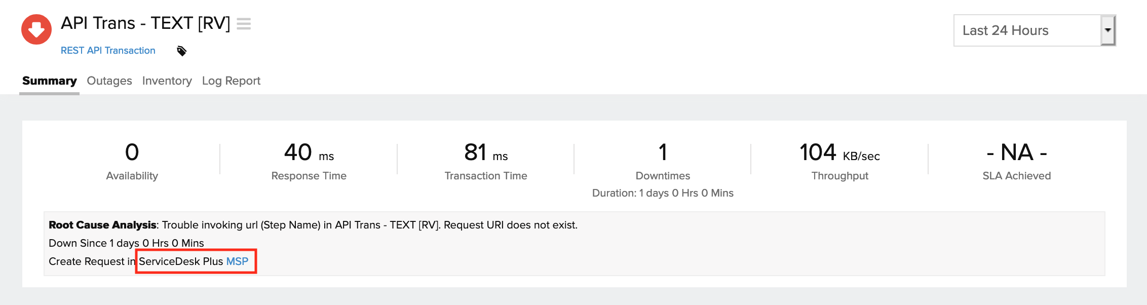 - 访问摘要状态小窗件下列出的“在 ServiceDesk Plus MSP 中创建请求”链接。您也可以从 RCA 页面访问相同的链接。