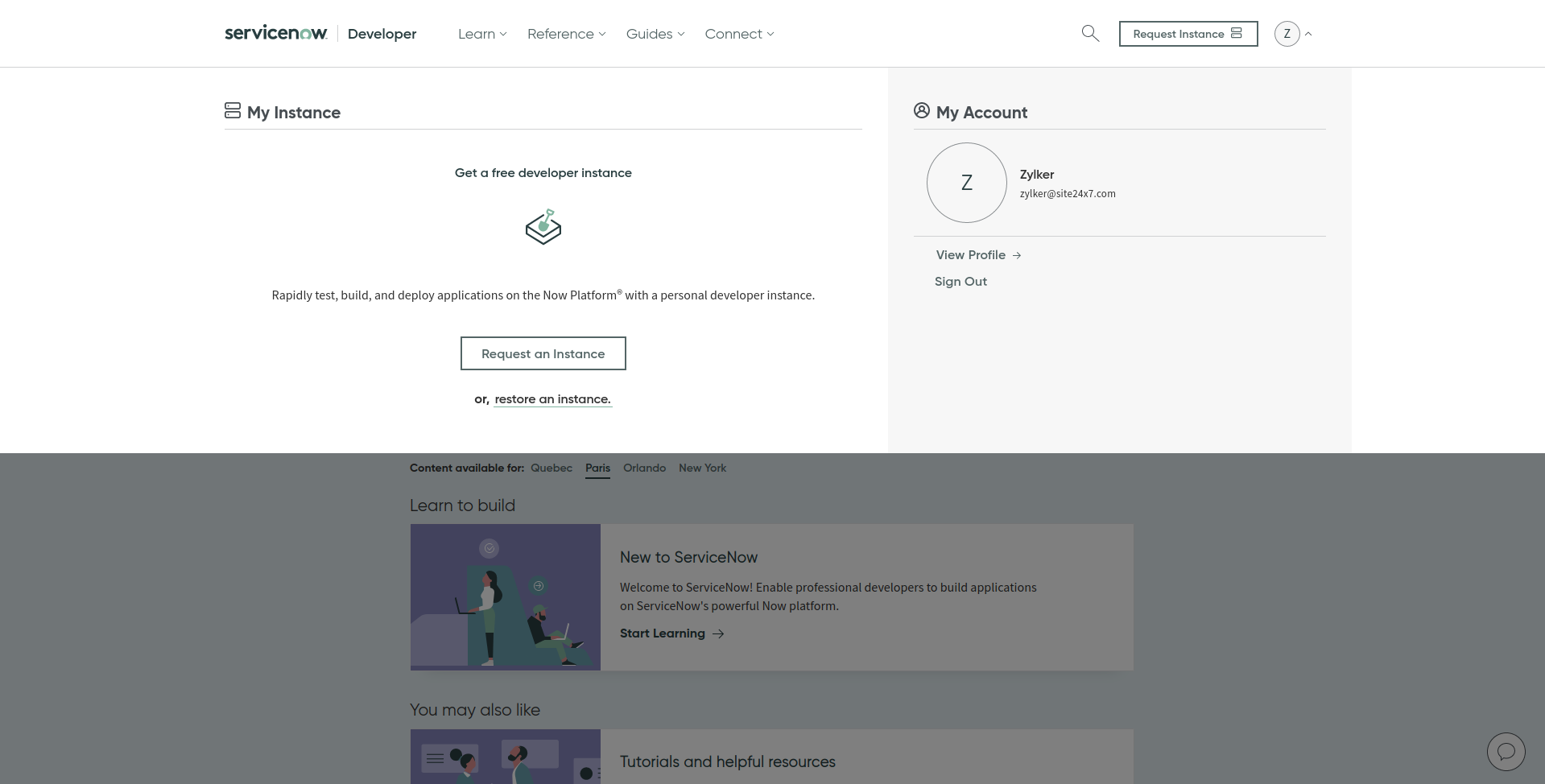 - 在 ServiceNow 构建上请求实例后,您必须生成实例 URL和登录凭证。复制并保留实例 URL 和登录凭证以成功与 Site24x7 集成。了解有关ServiceNow 实例创建的更多信息。