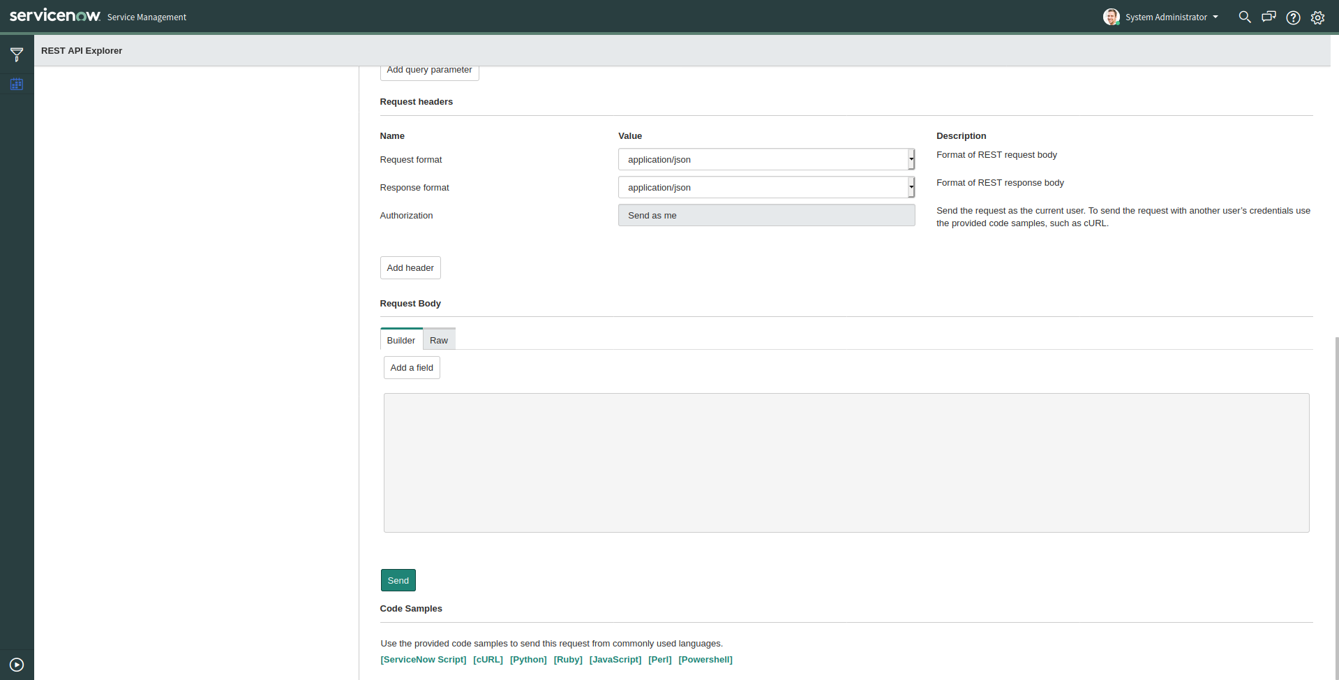 - 您可以访问实例 URL 以查看服务管理门户。在服务管理门户中,您可以快速构建访问 ServiceNow 入站 REST API 的请求。您可以使用这些数据来构建集成的 REST 请求。此外,您可以使用实例中的表信息来提供端点、方法和变量的列表。