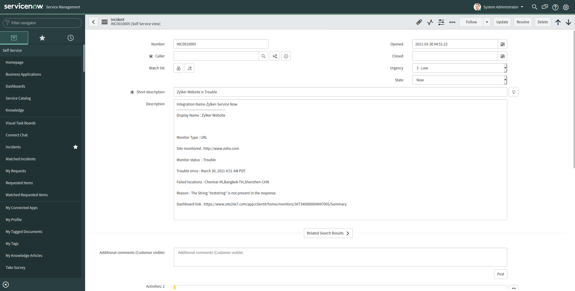 - 根据 Site24x7 监控告警手动或自动打开、解决和关闭 ServiceNow 事件。您还可以调查事件的根本原因,向技术人员分配告警,并无缝管理告警。