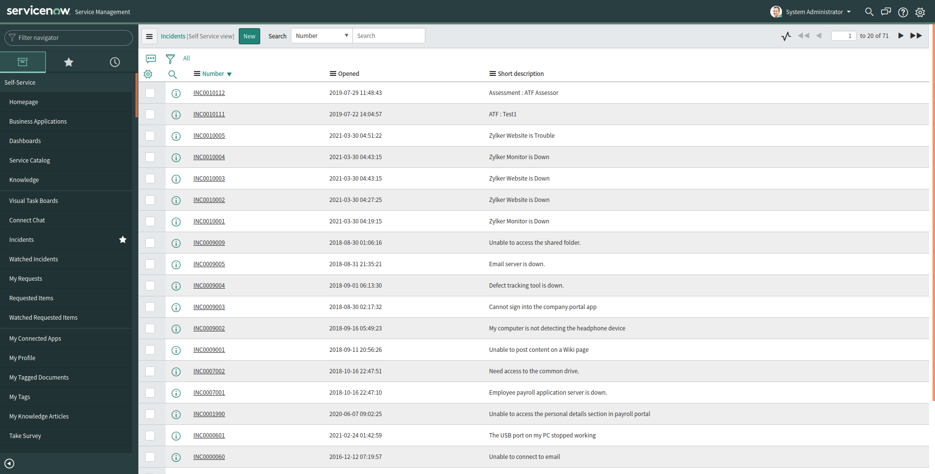 将 Site24x7 帐户与 ServiceNow 的 ITSM 平台集成后,您将能够在 ServiceNow 门户内的单个仪表板中查看所有事件工单。通过使用 ServiceNow 门户左侧面板上的过滤导航图标,您可以访问以下视图: