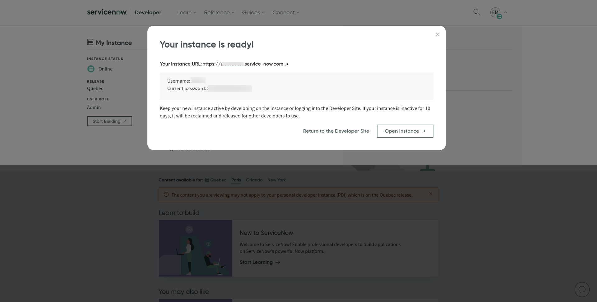 - 创建 ServiceNow 实例后,您将获得一个唯一的实例 URL 和访问该实例的凭证。您必须复制并保留用于集成的实例 URL和实例登录凭证。