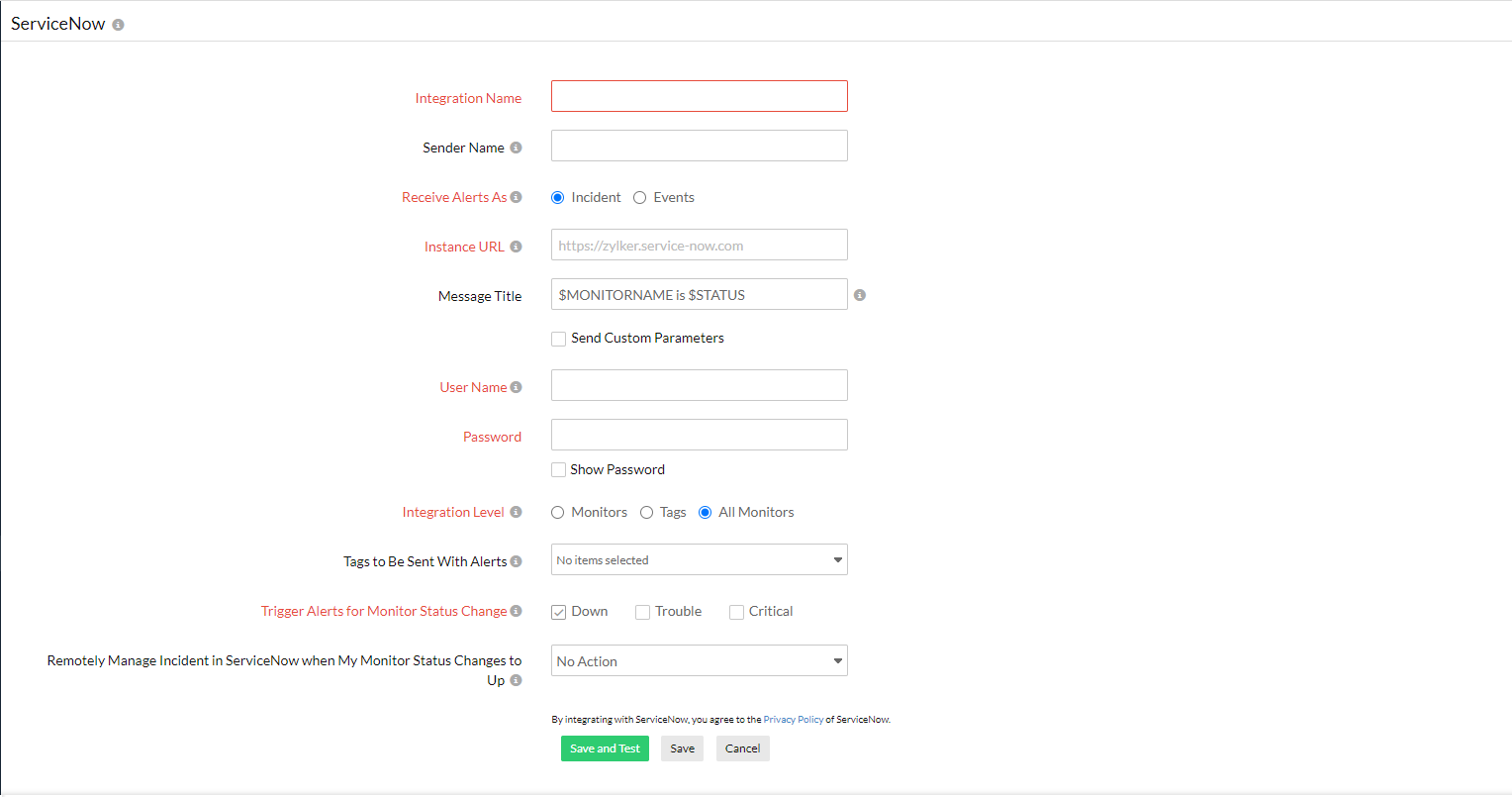 了解如何获取ServiceNow 实例的用户名和密码。 - 集成级别:您可以将告警作为 ServiceNow 事件从特定监视器、与选定标签关联的所有监视器/监视器组或您帐户中的所有监视器发布。默认情况下,它设置为“所有监视器”。因此,它转化为全球集成,您的 Site24x7 帐户中的所有告警都被推送到 ServiceNow。