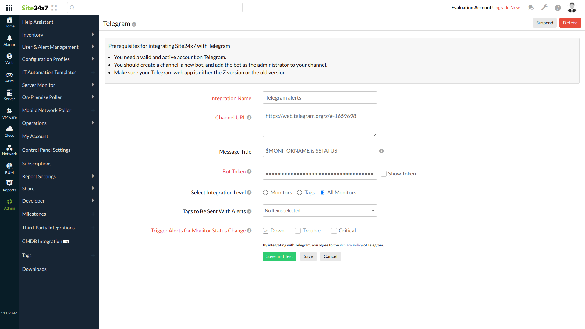 要将您的 Site24x7 帐户与 Telegram 集成: