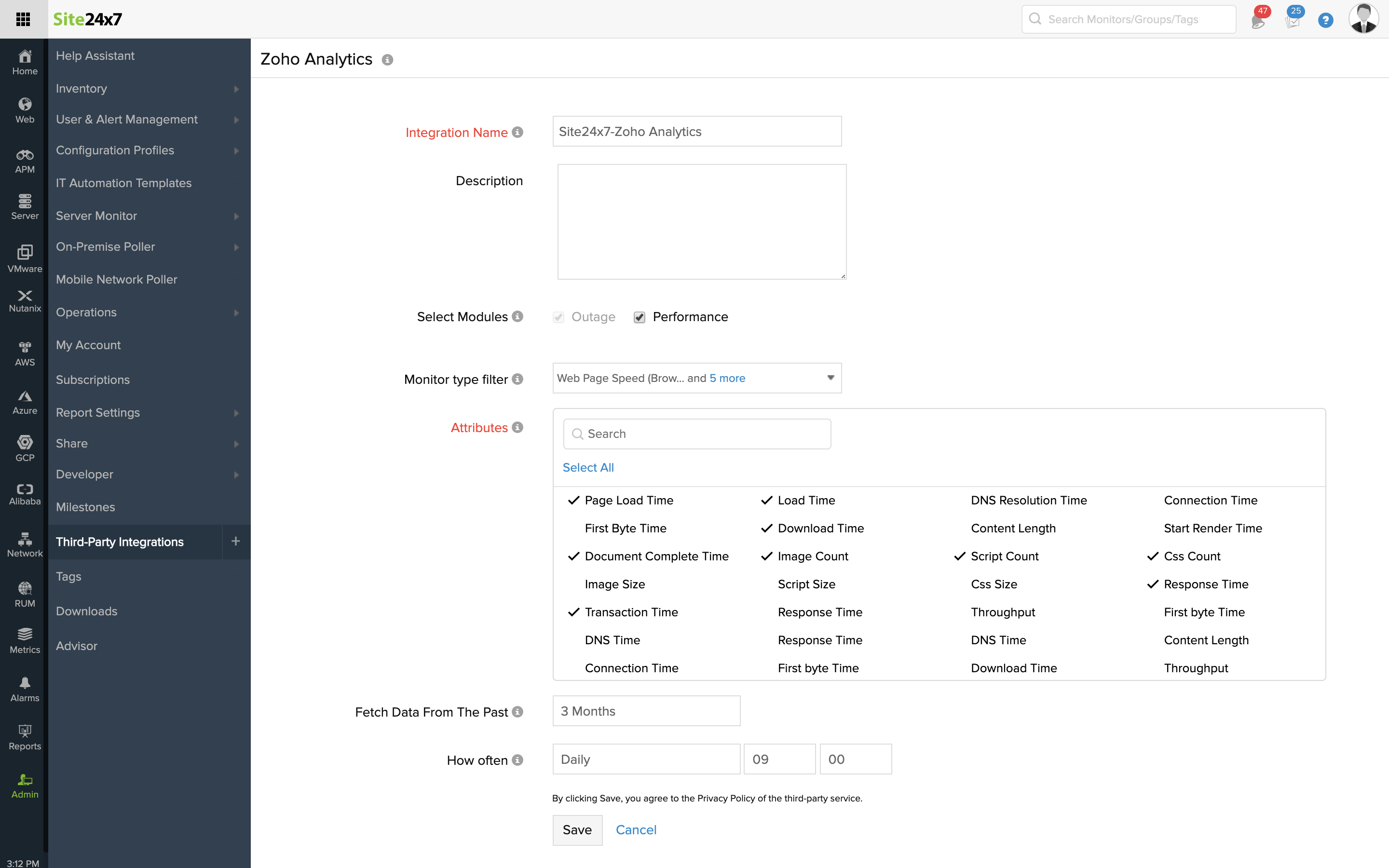 - 从过去获取数据:选择您希望从 Site24x7 同步数据的时间段。您有三个选择:三个月、六个月和十二个月。