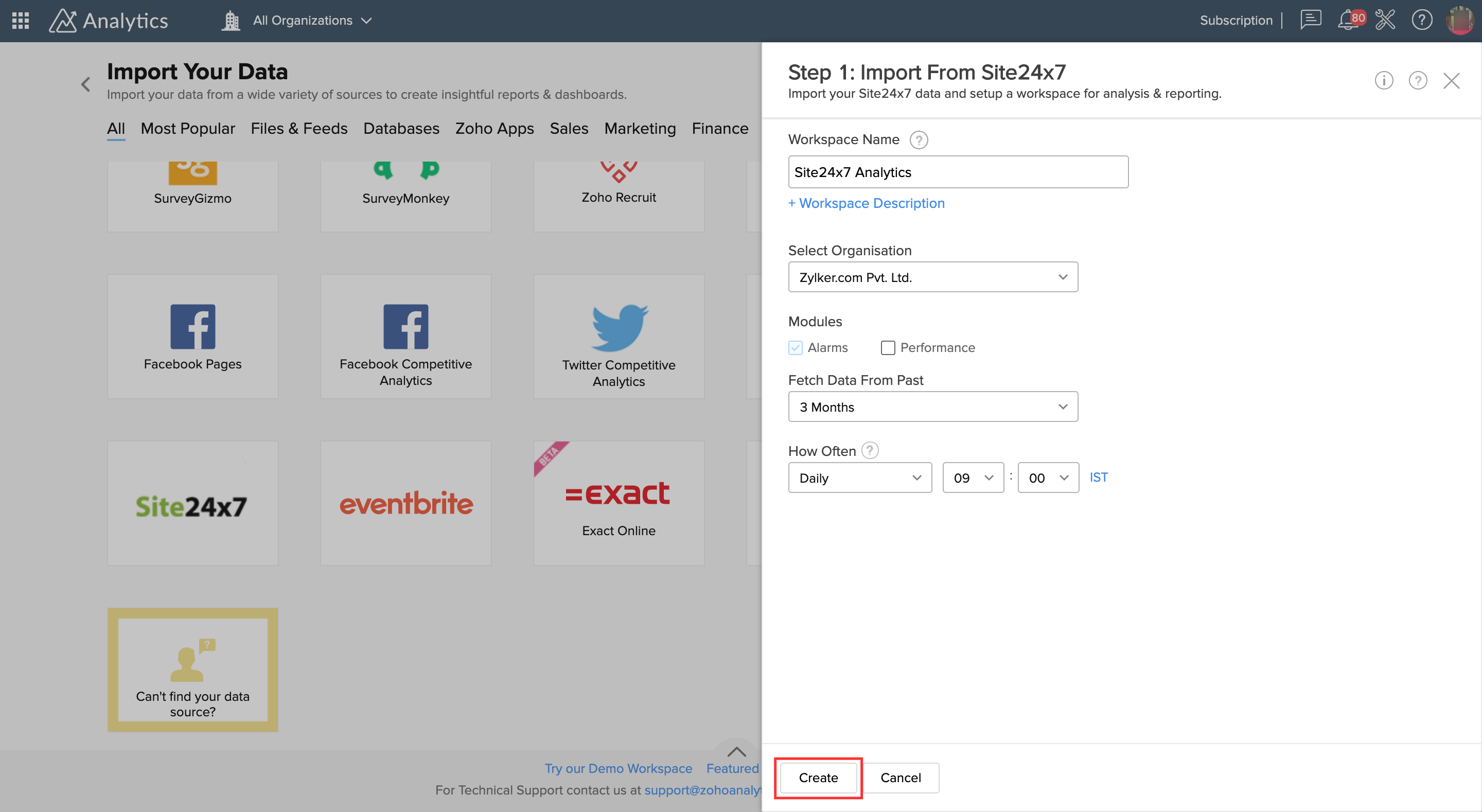 - 单击创建按钮以从Zoho Analytics开始集成。