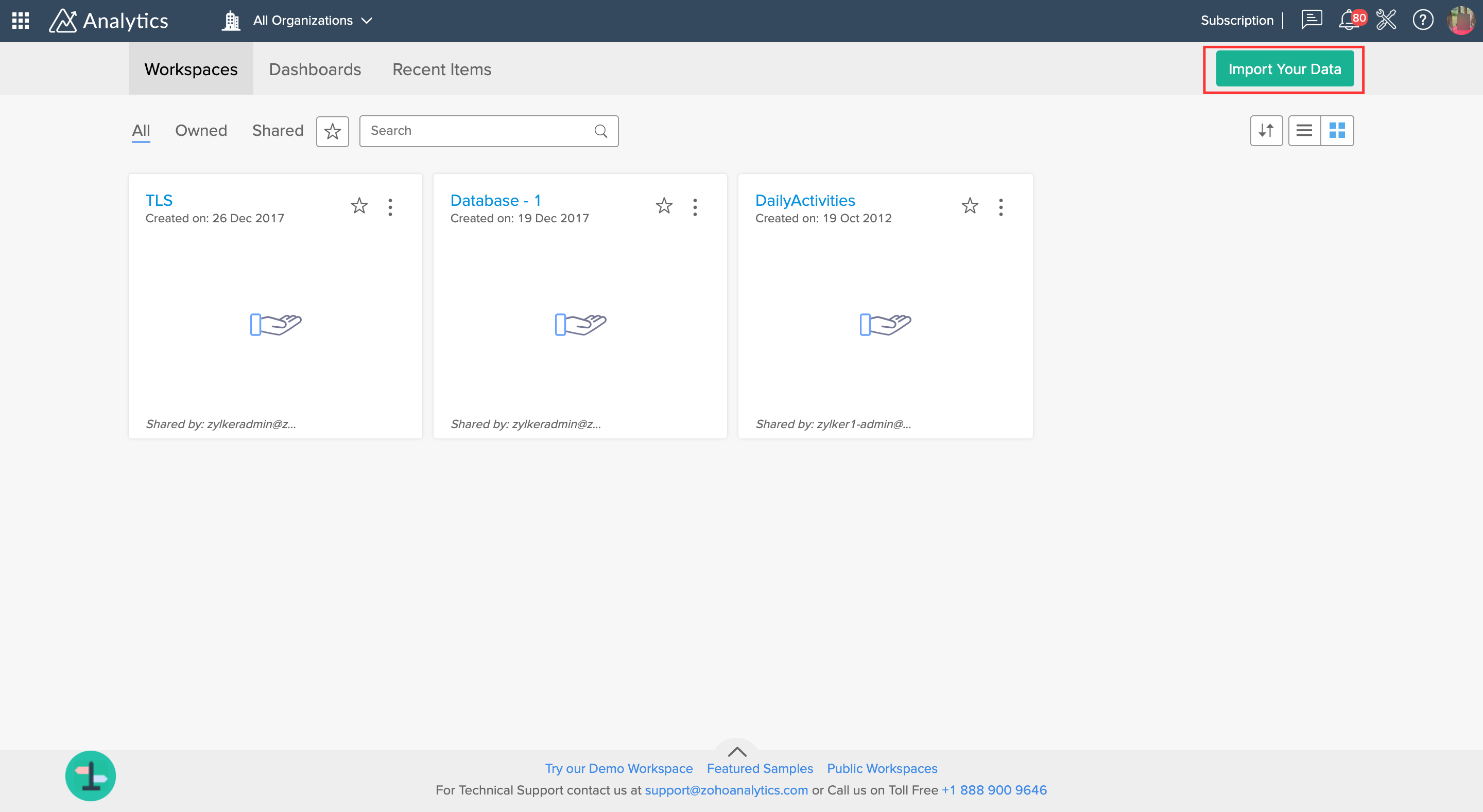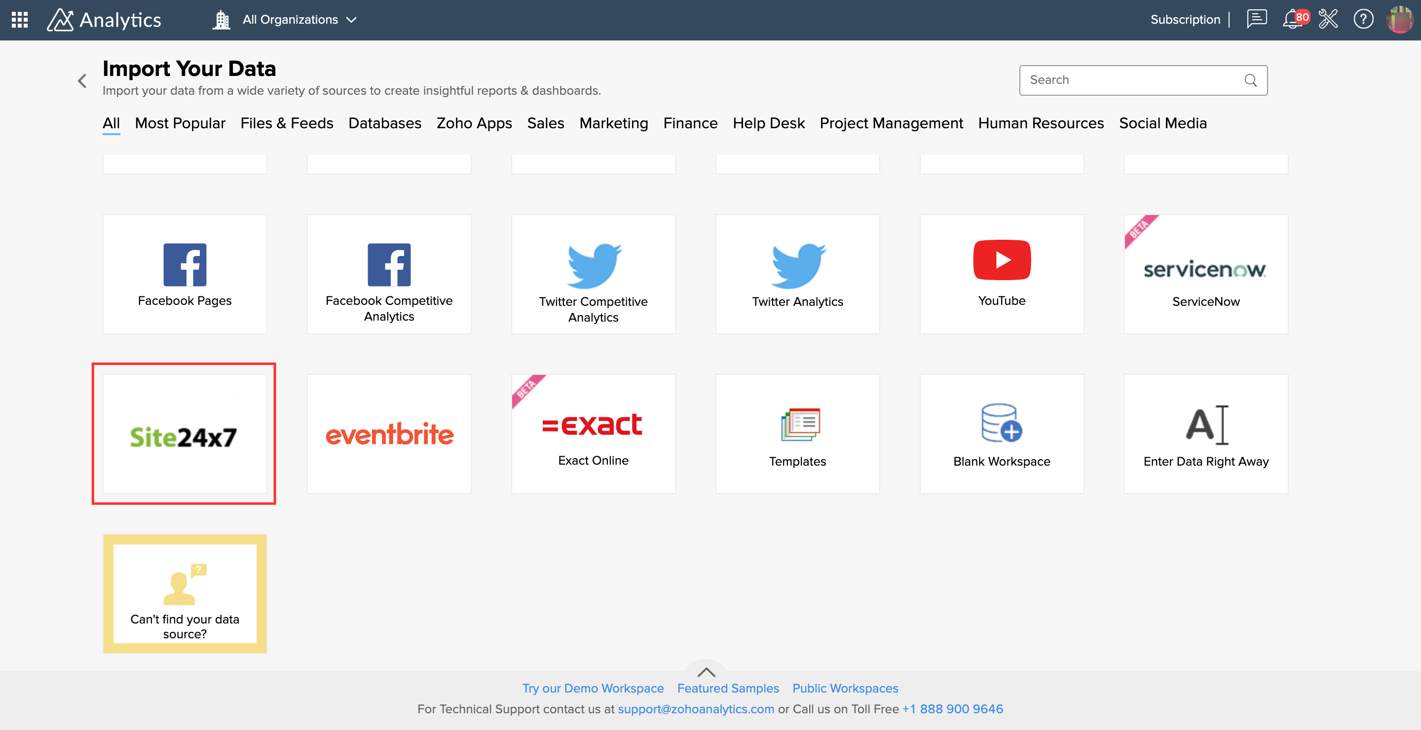 - 要从 Zoho Analytics 启动集成,请单击 主页上的导入您的数据按钮。