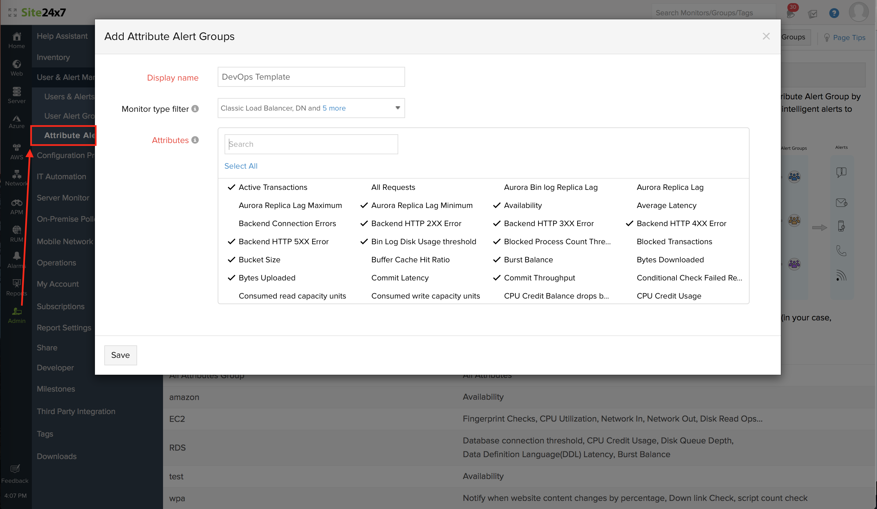 下面介绍如何使用属性告警组。假设您是 DevOps 团队的一员,并且您希望单独接收与服务器监视器属性(例如 CPU 利用率、磁盘已用空间 (%) 等)有关的告警。你怎么能实现它?首先,您必须创建一个基于属性的模板(我们称之为“DevOps 模板”),仅托管您想要监控的相关服务器属性。假设您添加了以下服务器属性: