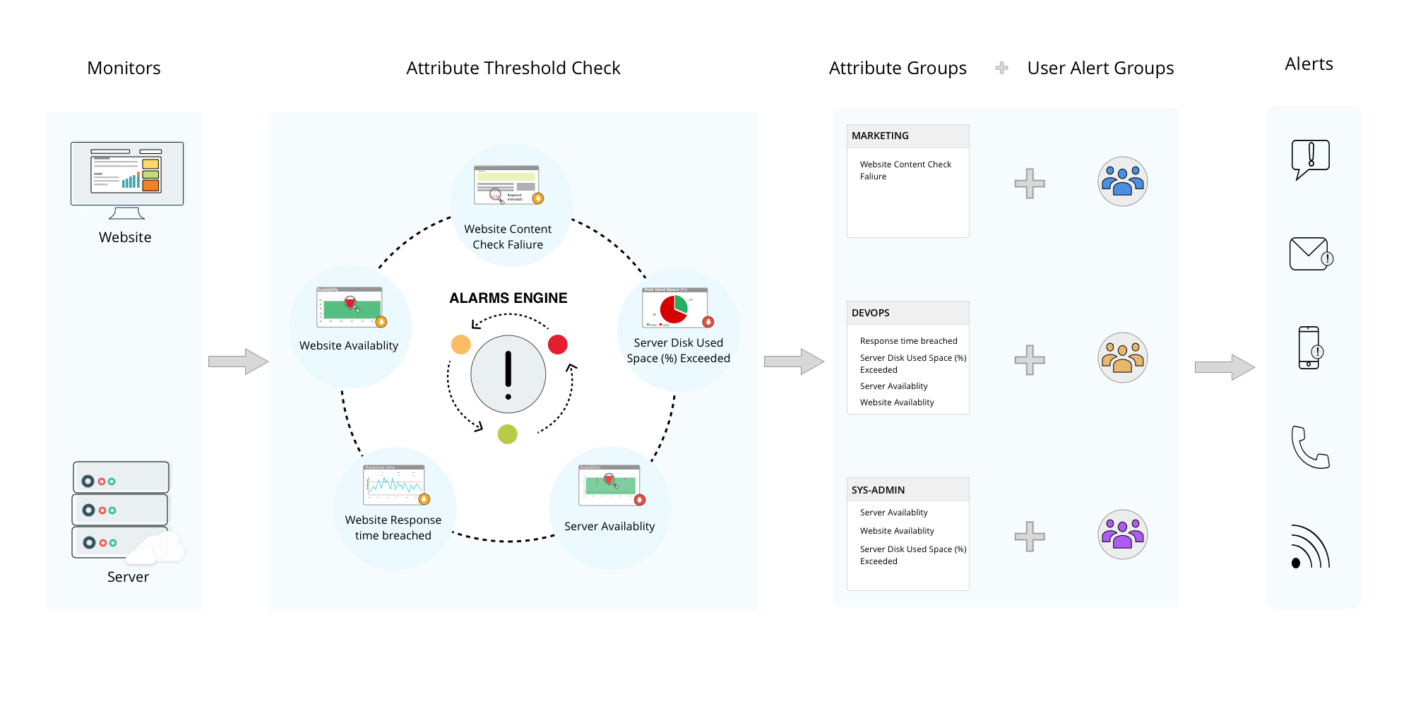 理想情况下,您只希望在违反这些服务器监视器属性的设置阈值时接收告警。创建属性模板后,将模板与您的预配置用户告警组“DevOps 团队”相关联(该组又与您的服务器监视器链接)。下次,您的服务器监视器遇到中断时,告警引擎将首先验证 DevOps 模板中列出的任何属性是否触发了中断。如果它发现这是真的,则会立即向 DevOps 团队触发告警。但是,如果中断不是由上述任何属性引起的,则会自动抑制告警。即使这样,事件也不会丢失,因为它会记录在告警日志中,并带有记录“监视器名称+“没有配置为接收告警的联系人:”+ 属性名称“。因此,您可以创建基于唯一属性的告警模板并将其关联到您的告警组以自定义您的告警策略。