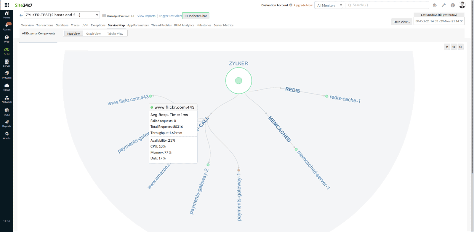 - 通过将鼠标悬停在组件上,查看与相应组件映射的服务器的关键指标,例如可用性、CPU、内存和磁盘利用率。单击指标可访问相应节点的服务器指标选项卡。