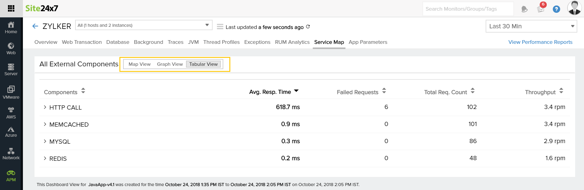 图表视图列出了平均响应时间、总响应时间、吞吐量、总请求数、错误数和错误率等参数。可以查看所有组件、对应于各个组件的所有主机以及各个主机的这些指标。