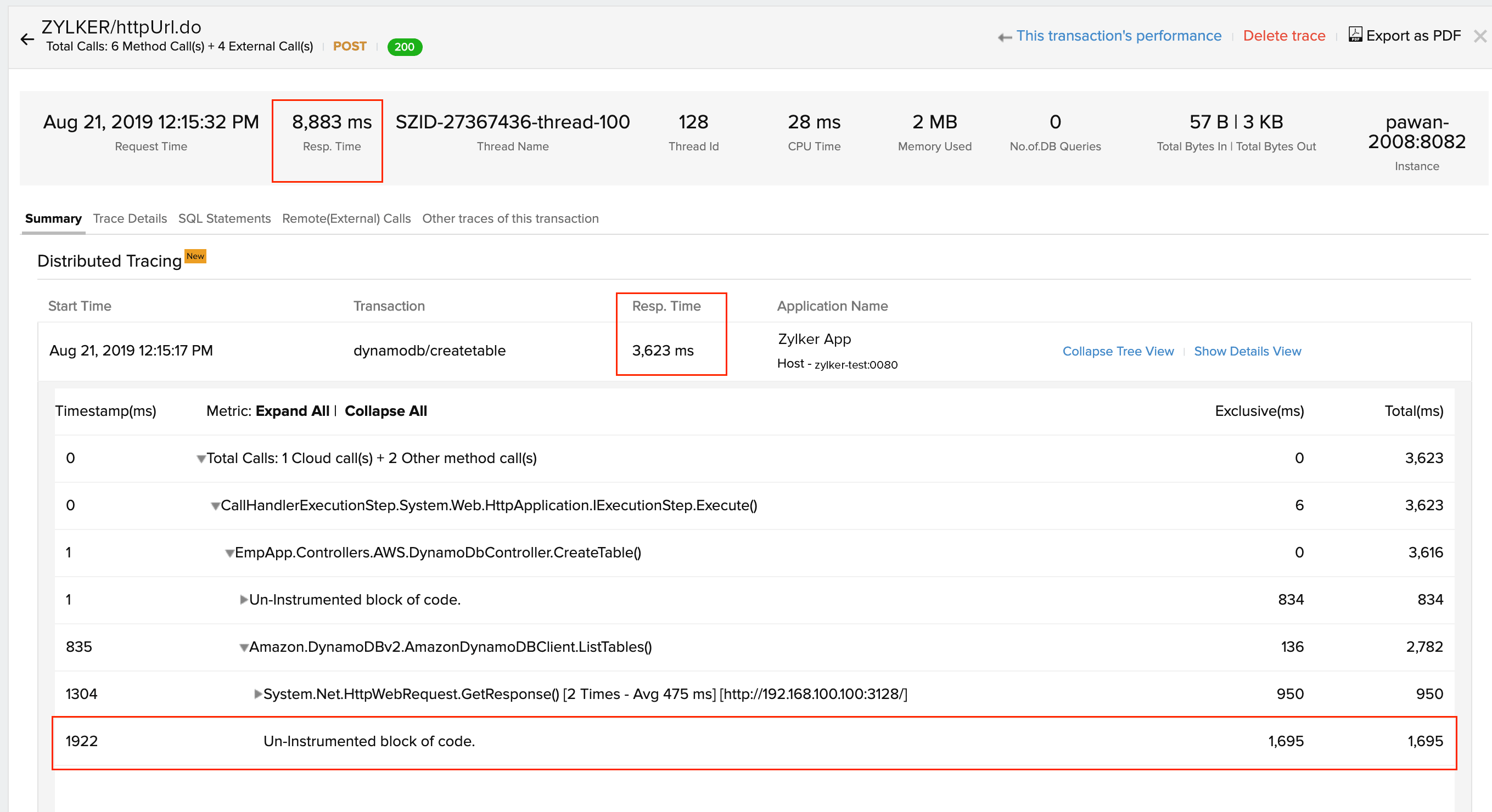 顶部栏显示详细的指标,例如事务占用的总响应时间(在本例中为 8,883 毫秒)、其中一个事务贡献的部分响应时间(3,623 毫秒)、内存使用情况等。通过单击应用程序名称右侧的展开树视图,您可以查看花费大量时间来完成此请求的方法调用和代码块。