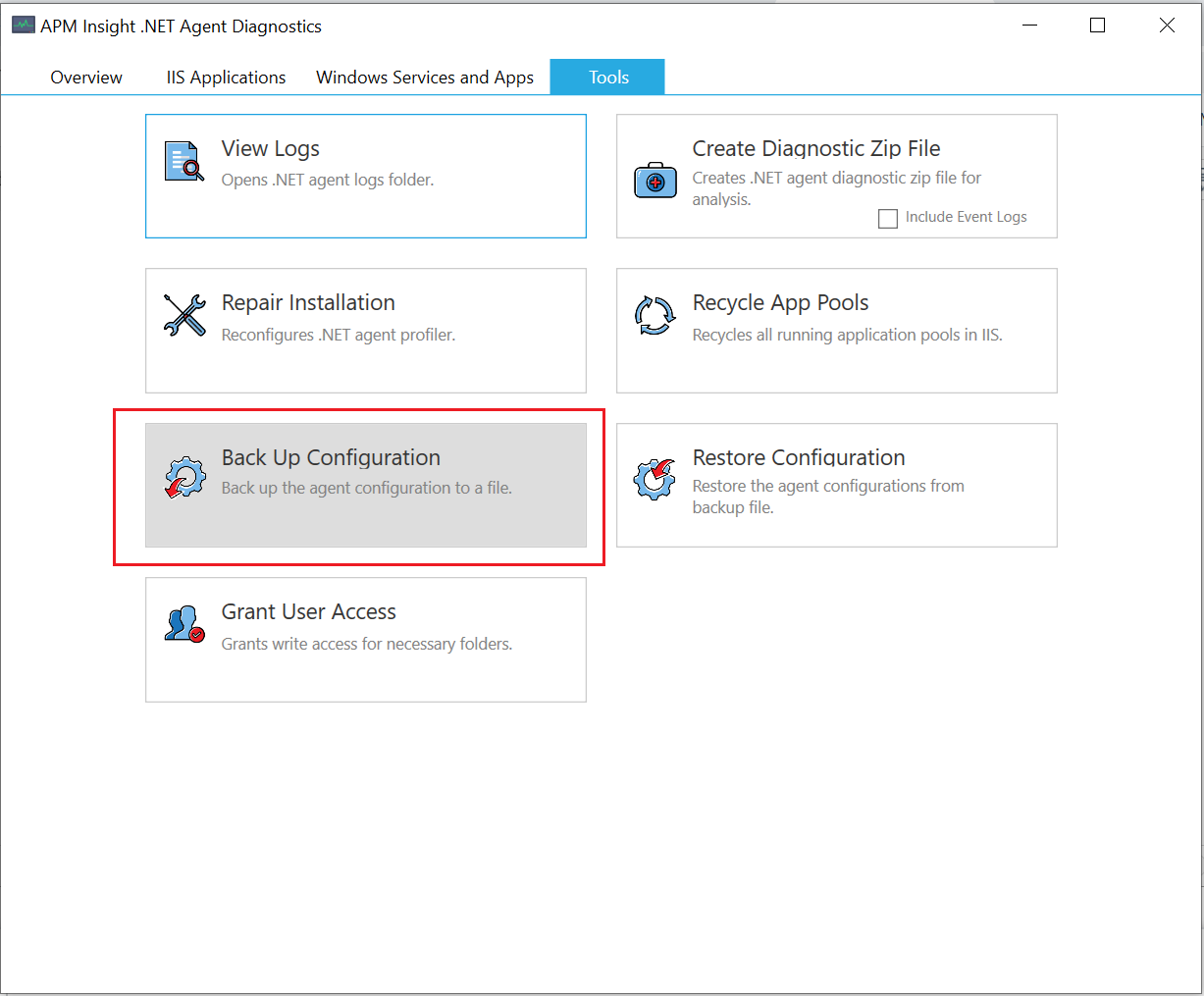 - 单击备份配置将在您选择的位置创建一个 DotNetAgentConfigBackUp.zip 文件。