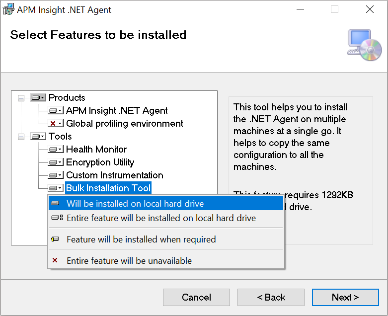 - 安装.NET 代理时, 请确保在功能选择页面上选择了批量安装工具 进行安装。
