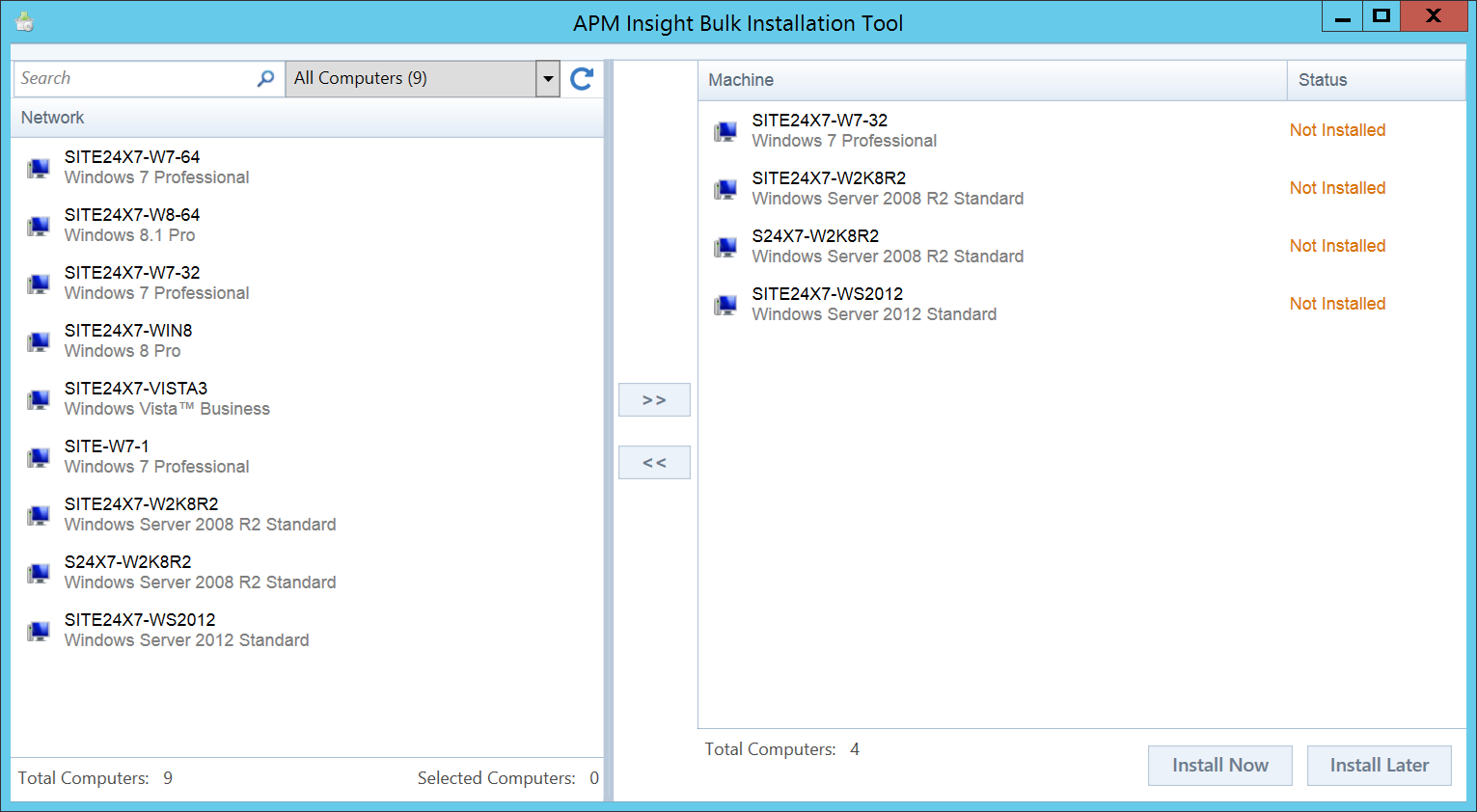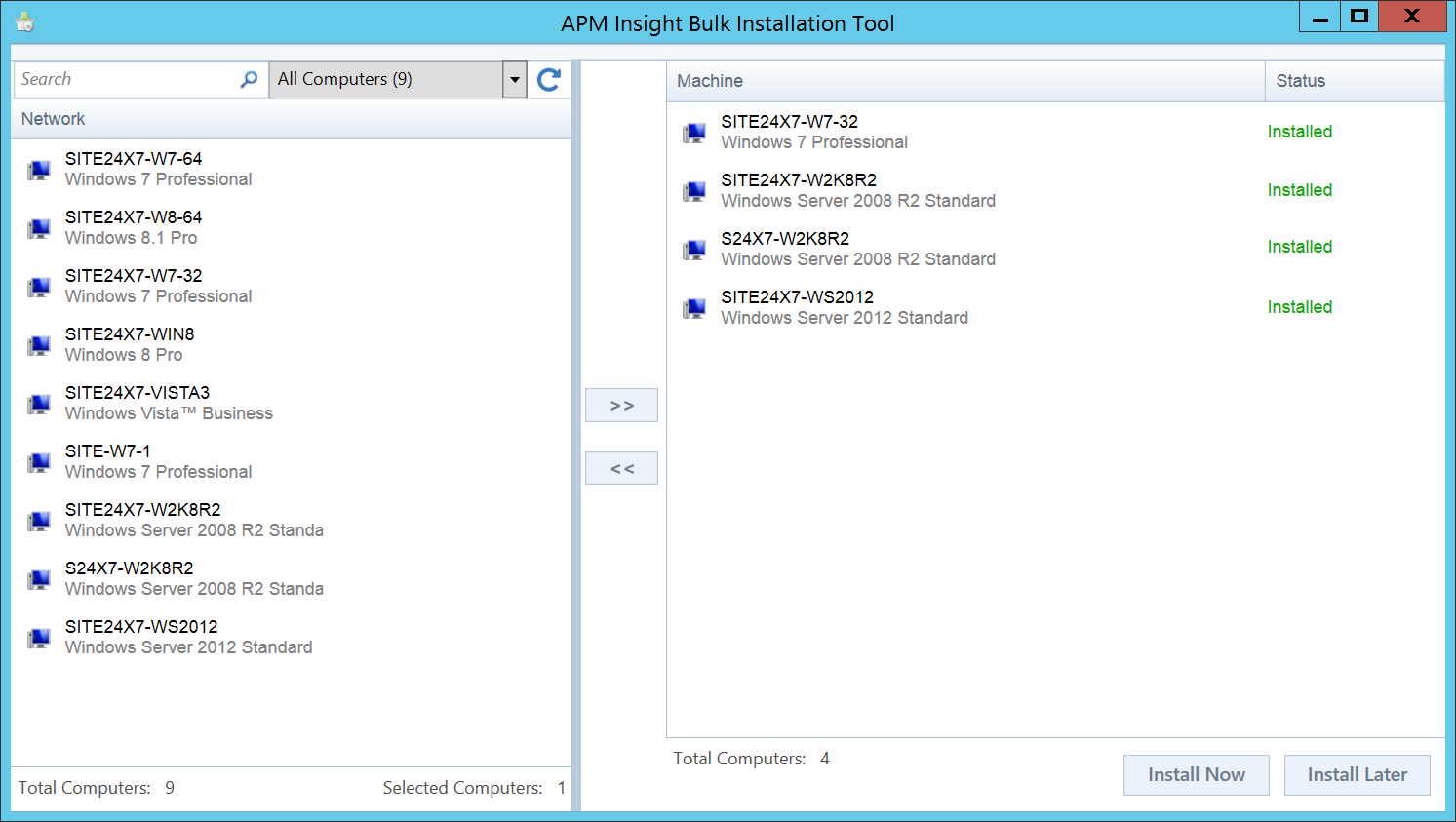 - 将显示来自当前网络域的机器。 选择适当的机器并添加 它们以进行代理 安装。