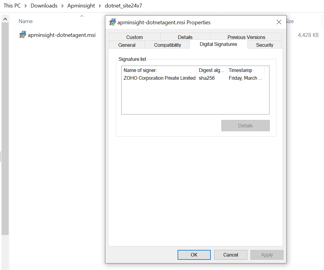 您可以使用 SHA256 校验和验证来验证下载的 Site24x7 代理的真实性。这可以确保下载的代理是可信的,并且不会被任何恶意代码或软件篡改。对于 .NET 代理,您可以使用 CertUtil 或 Get-FileHash 计算文件哈希,以使用代理校验和值验证校验和。验证代理的真实性: