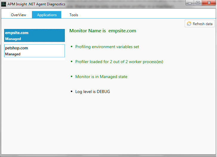 - 验证分析器状态- 为了成功检测 IIS 应用程序,必须将分析器加载到工作进程中。如果探查器加载失败,则必须执行 IIS 重置以重新加载探查器。此外,确保某些其他分析代理未安装在同一台机器上(即,一台机器中只能有一个活动的分析器)。