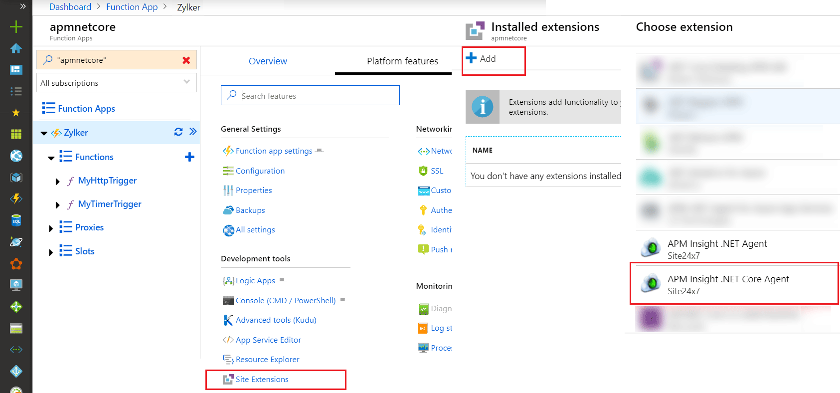 2.打开 Azure Function 应用程序并导航到平台功能 > 站点扩展链接。