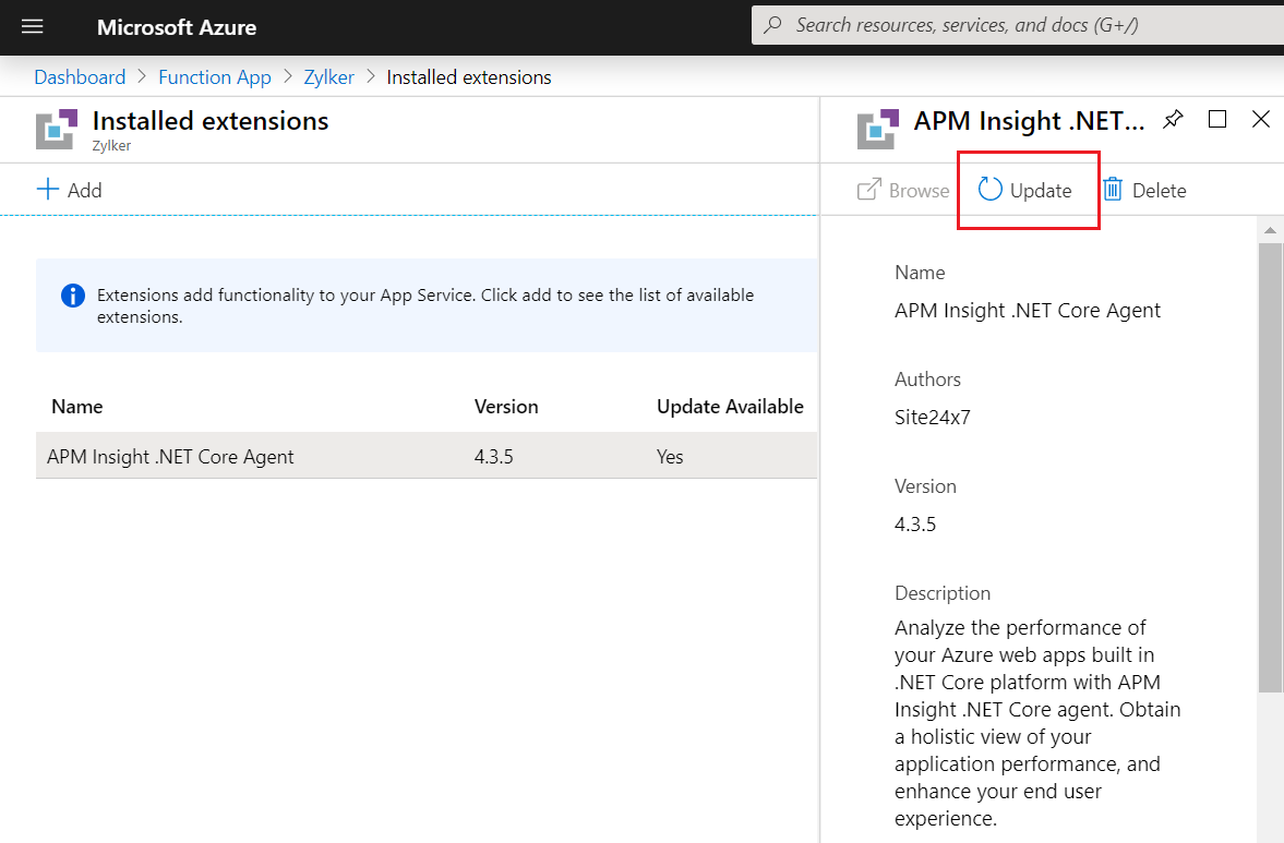 要升级 APM Insight 代理以监控您的 Azure 功能,请按照以下说明进行操作: