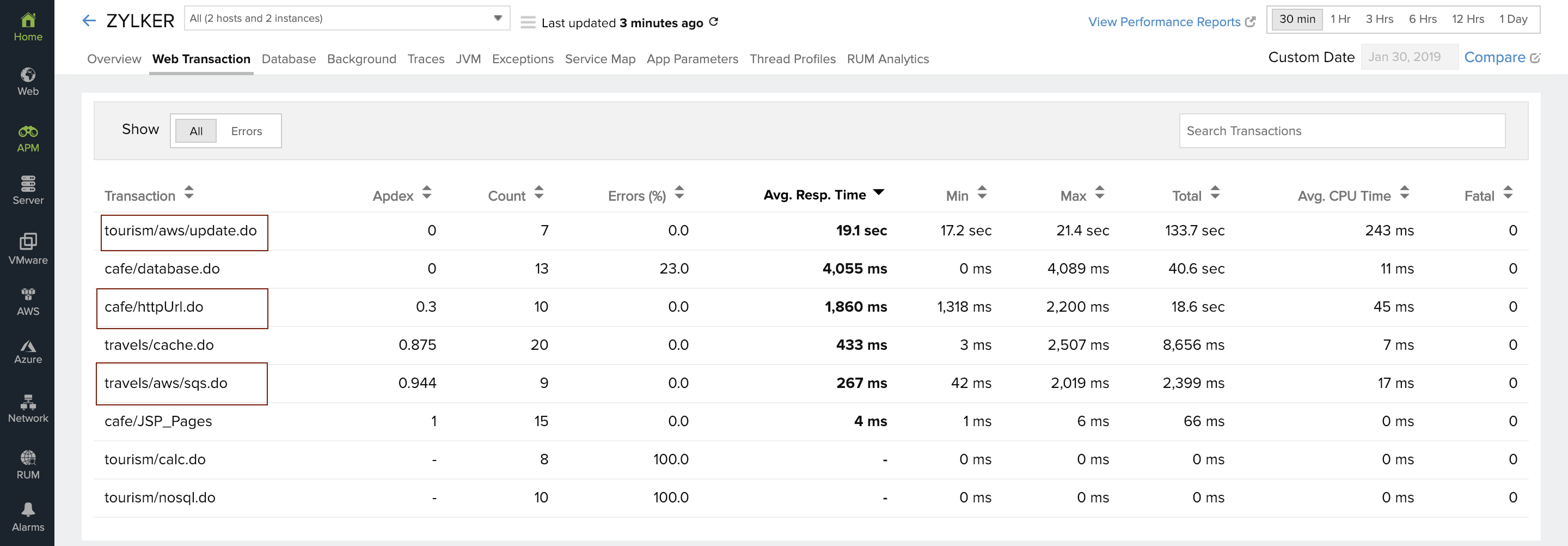 这三个应用程序的事务在Web Transaction选项卡中列出。