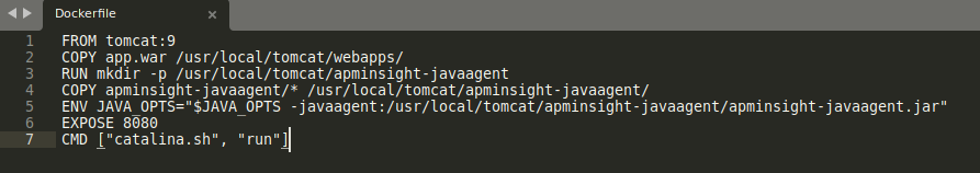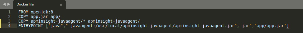 - 将所有 APM Insight Java 代理文件复制到目标容器内的目录后,Dockerfile 将如下所示: