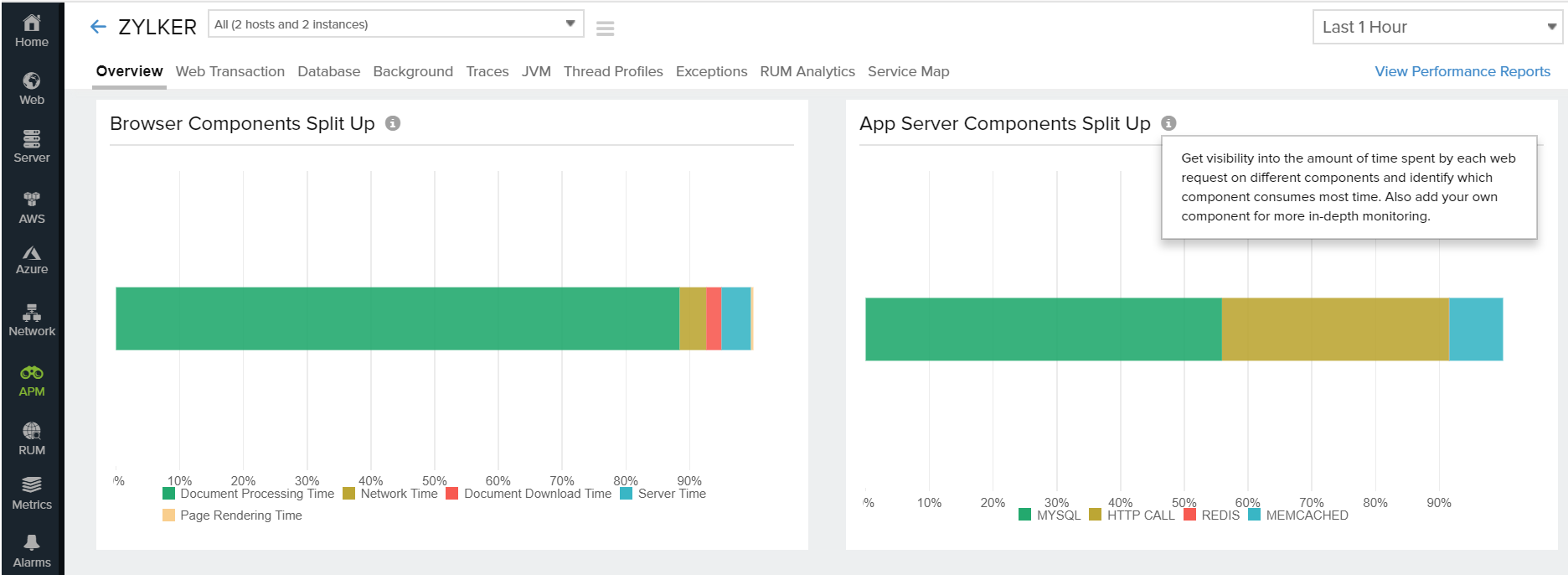 分析各个组件的响应时间以及它如何影响您的整体应用程序响应时间。选择一个时间段,应用服务器组件的响应时间图将说明特定组件与其他组件相比所花费的时间。这可以帮助您查明执行缓慢的组件并优化您的代码流。