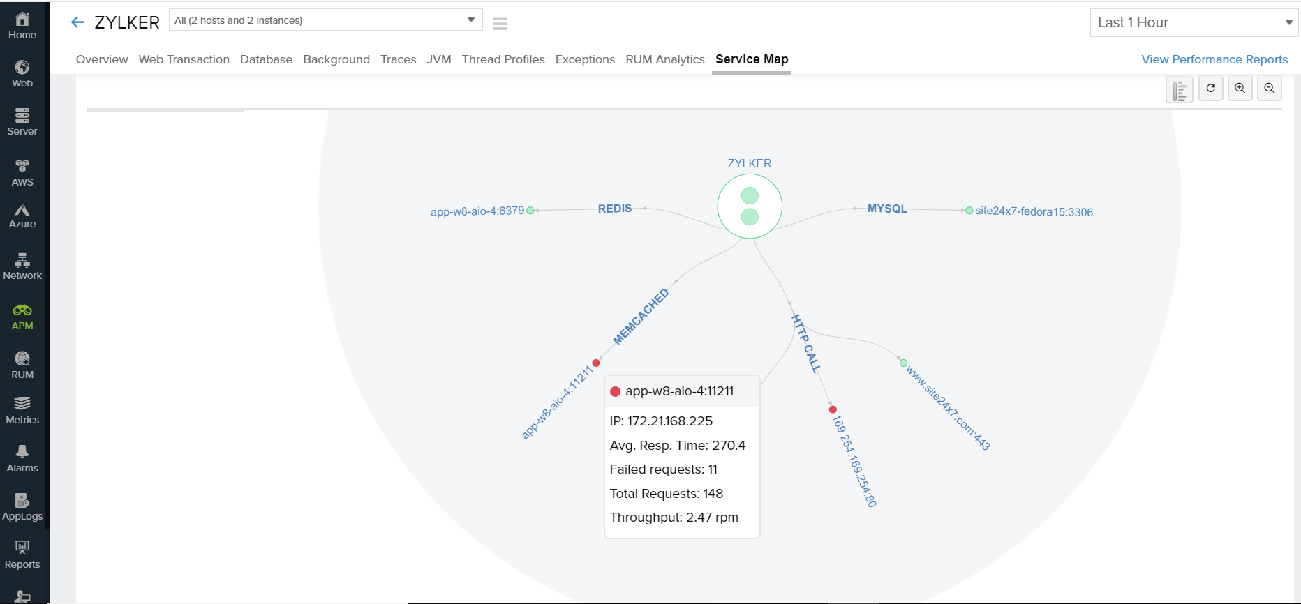 使用应用程序依赖映射查看您的应用程序连接并与之通信的组件。使用应用程序依赖映射,您可以跟踪每个组件的请求总数以及失败请求的数量。当您的任何组件遇到失败的请求时,您还可以获得概览图。这有助于您在最终用户受到影响之前迅速采取行动。