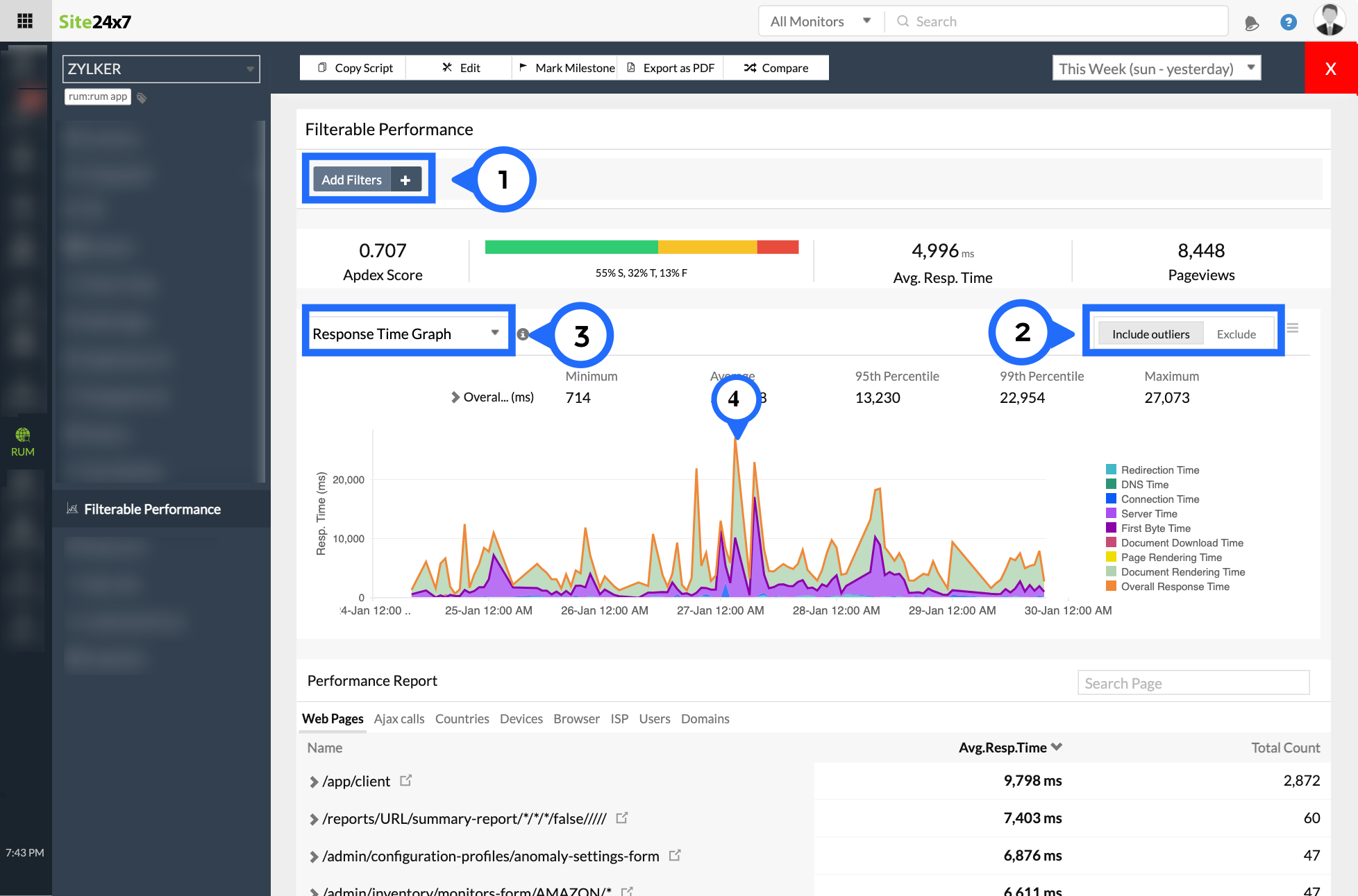 - 登录到您的 Site24x7 帐户 > RUM > 您的应用程序 > 可过滤性能