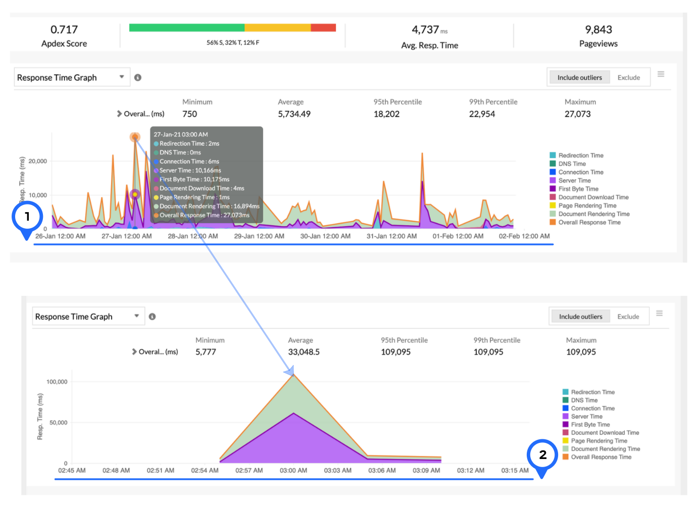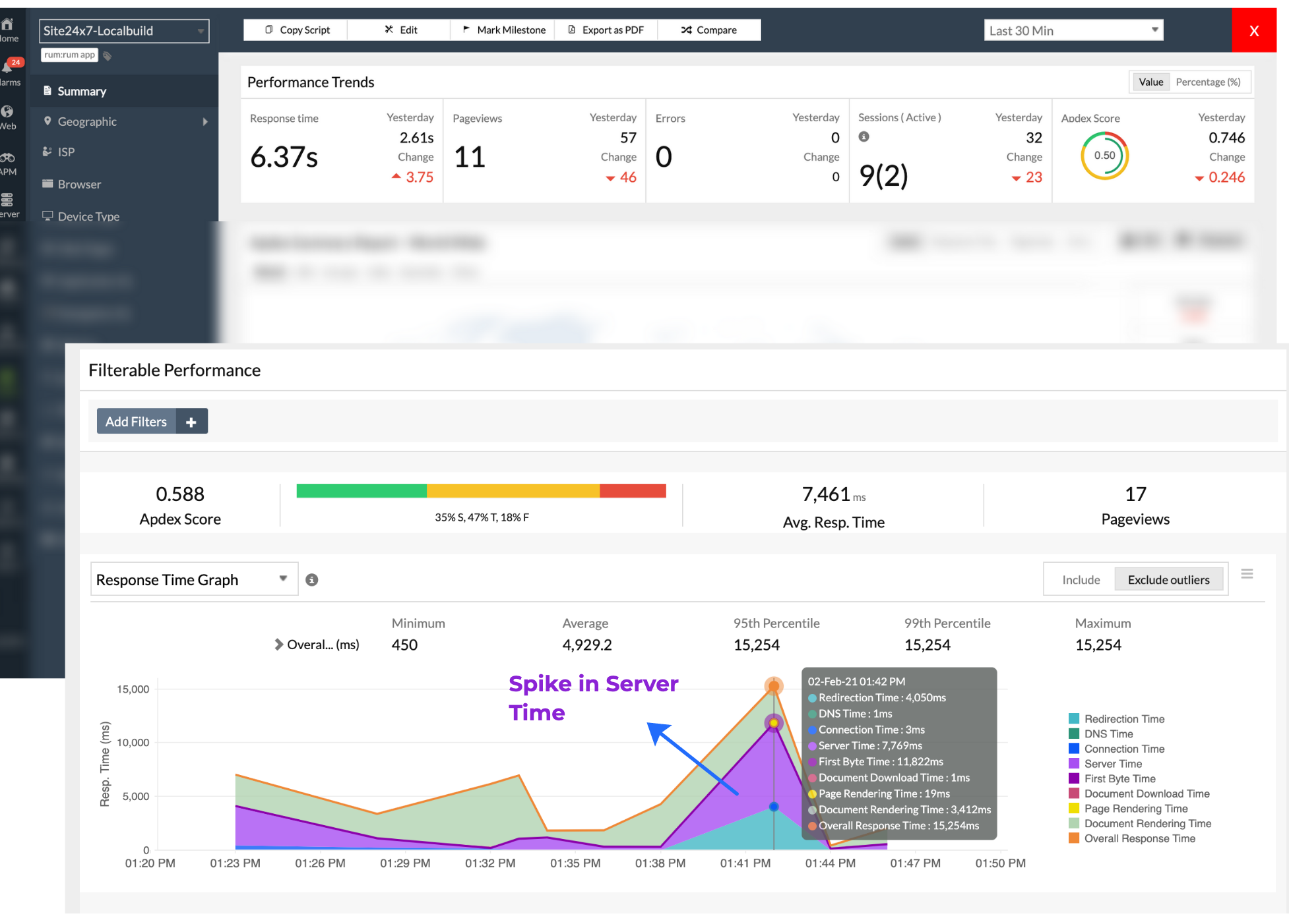 在图 3 中,过滤器性能图显示响应时间峰值是由于事务或 Ajax 调用的增加,这是一个特定的服务器问题。