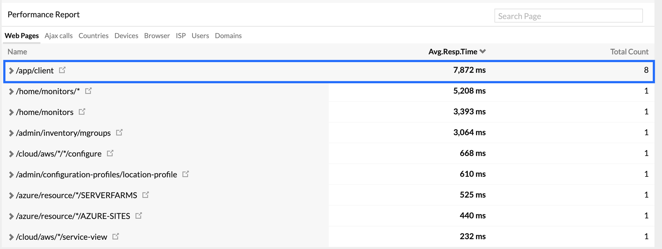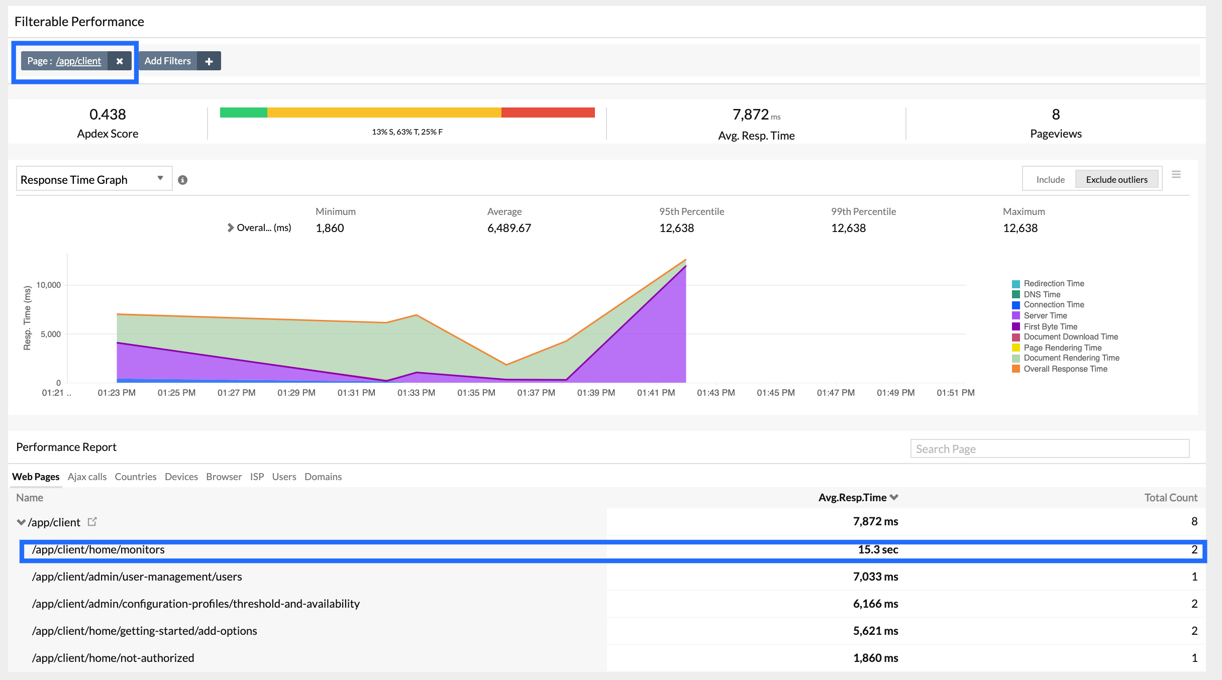 - 单击添加过滤器以根据浏览器、用户、设备、国家和 ISP 深入了解性能。您还可以过滤和查看单个网页或 Ajax 调用的性能。