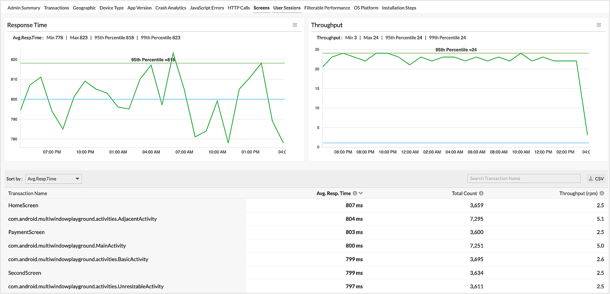 借助 Screens,您可以深入了解用户浏览过的所有屏幕、屏幕的平均响应时间、屏幕的吞吐量以及用户浏览到该特定屏幕的总次数。