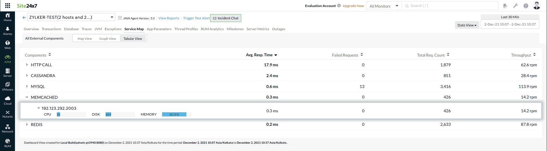 表格视图列出了所有组件及其关联的服务器。单击单个服务器会将您带到相应的表视图,单击指标栏会将您带到相应的服务指标选项卡。