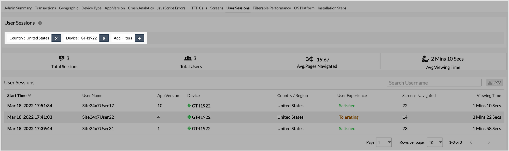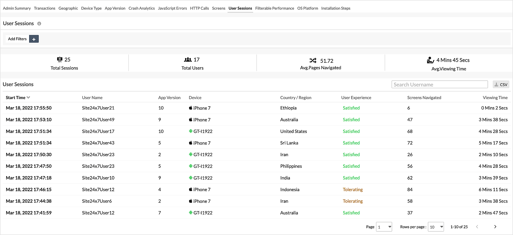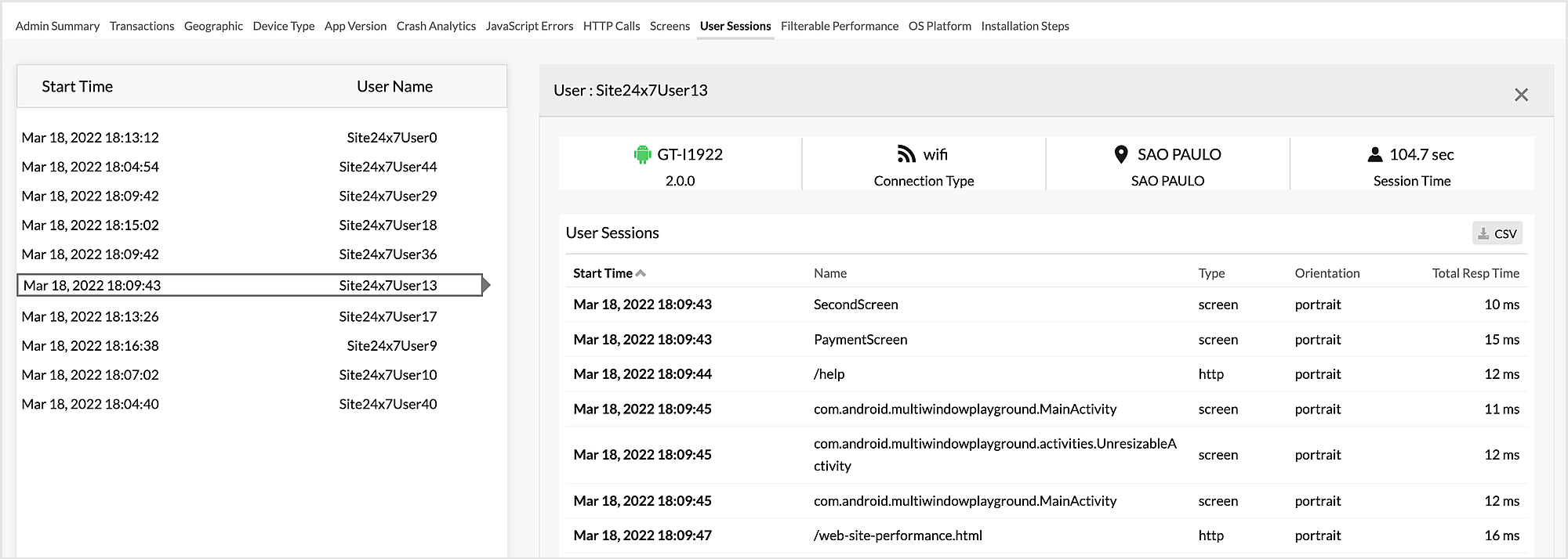 1. 登录您的Site24x7 帐户,然后导航至APM > Mobile APM > 应用 > 用户会话。