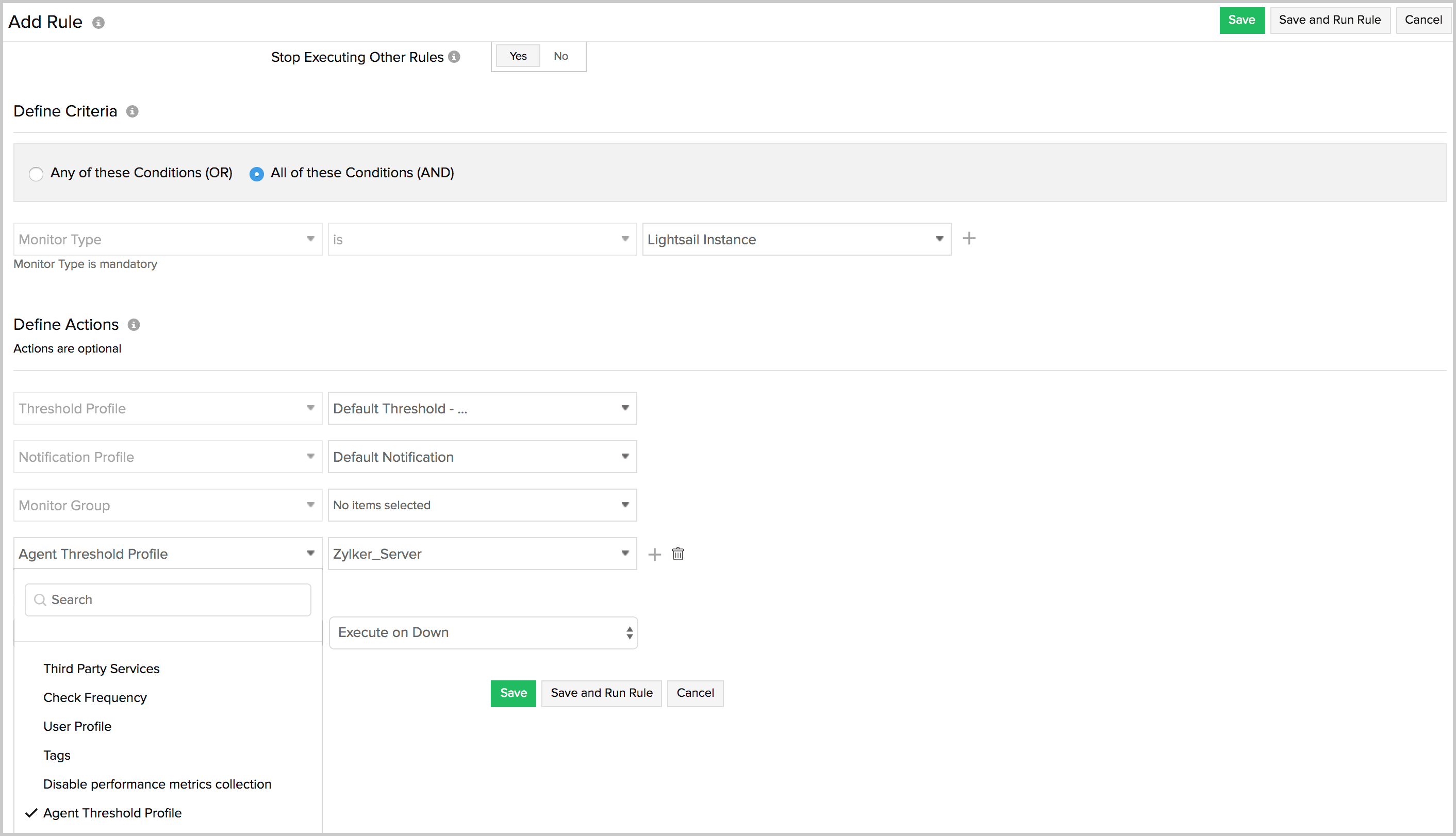 按照此处列出的添加配置规则的初始步骤。选择监视器类型作为Lightsail 实例。从下拉菜单中定义操作时,选择Agent Threshold Profile,然后选择要为服务器配置的所需阈值配置文件。