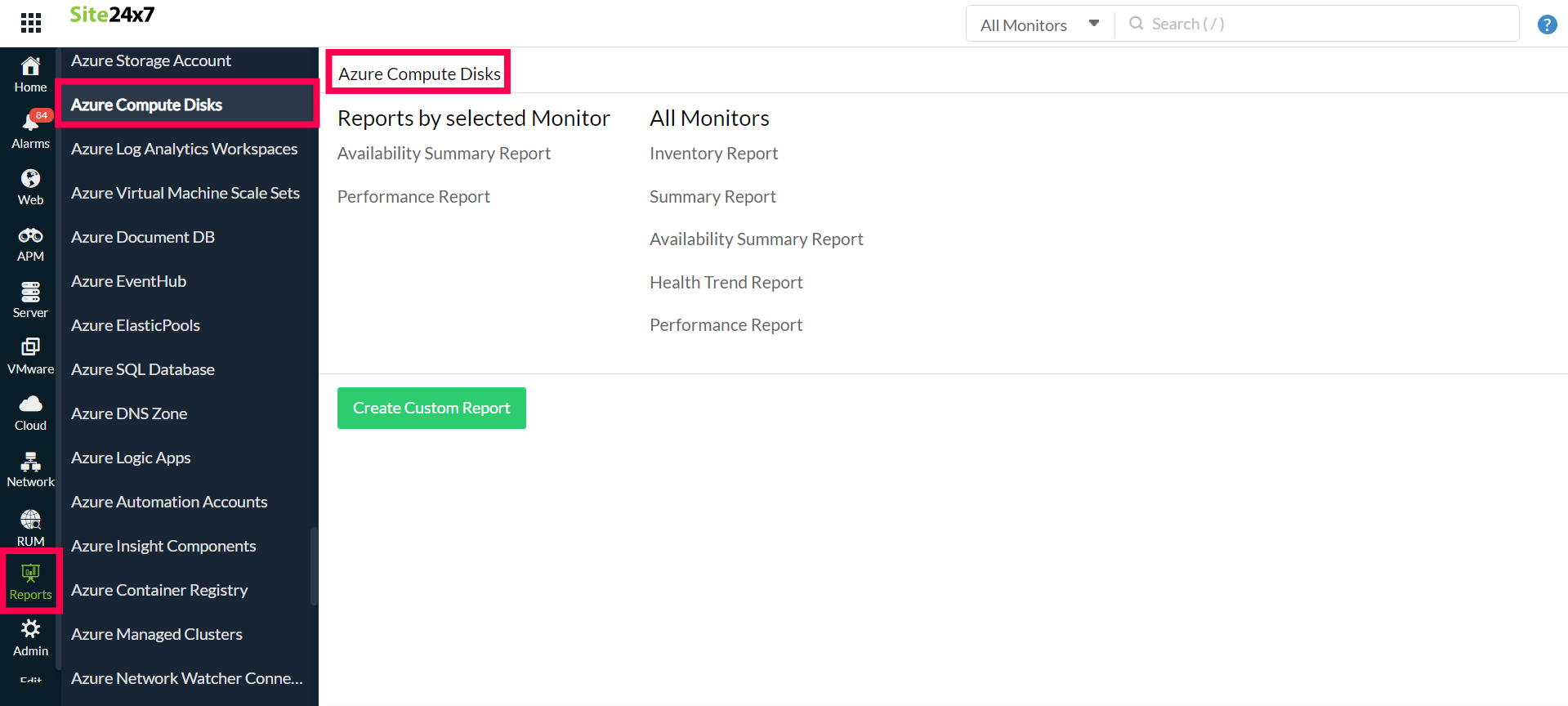 您可以找到一个选定监视器的可用性汇总报表和性能报表,或者您可以获得所有计算磁盘监视器的资源清单报表、汇总报表、可用性汇总报表、健康趋势报表和性能报表。